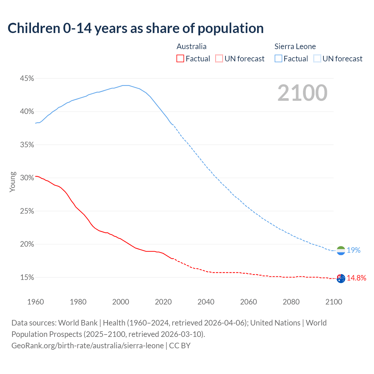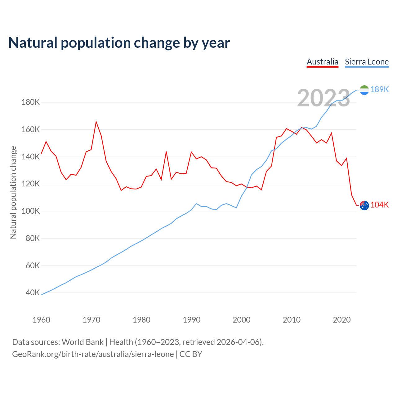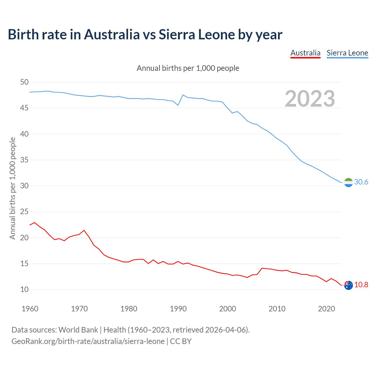Australia has an annual birth rate of 10.8 births per 1,000 people, compared to 30.6 for Sierra Leone. The average number of children a woman is expected to have during her lifetime — the fertility rate, is 1.5 in Australia and 3.79 in Sierra Leone — 152.7% difference.