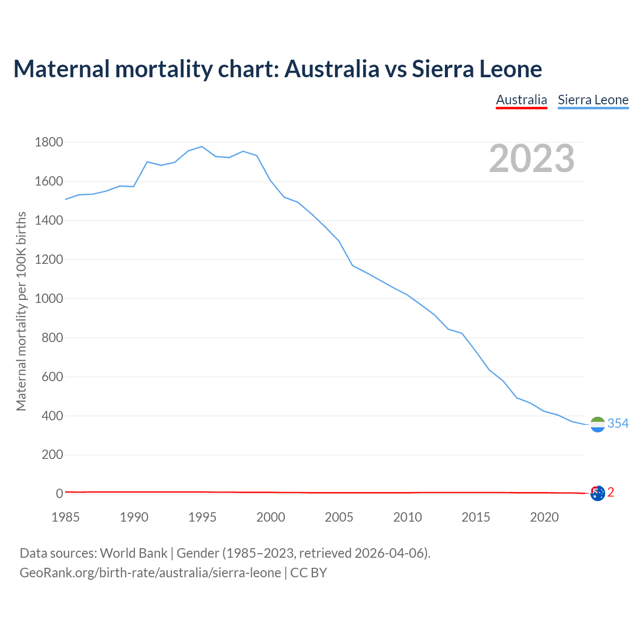 The maternal mortality rate, which is the probability of dying during childbirth or within 42 days of pregnancy termination, is 2 deaths per 100,000 live births in Australia, compared to 354 deaths in Sierra Leone.