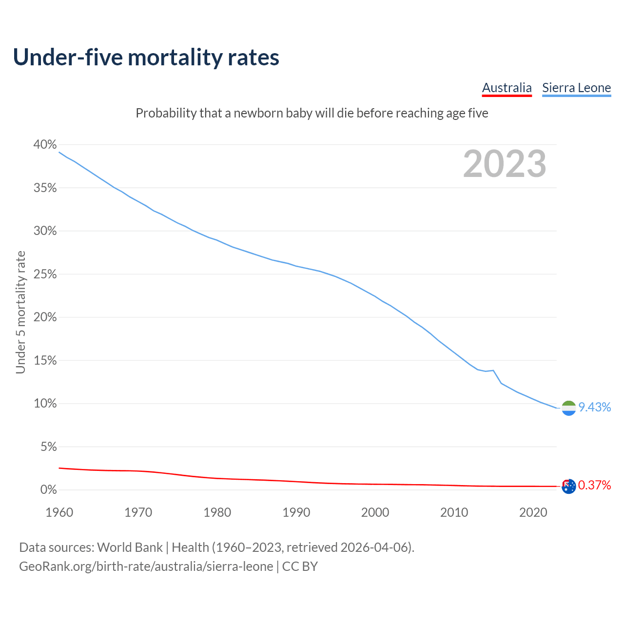 The chance that a newborn baby will die before reaching age five is 0.37% in Australia and 9.43% in Sierra Leone. Above is a chart with historical data on under-five mortality rates.
