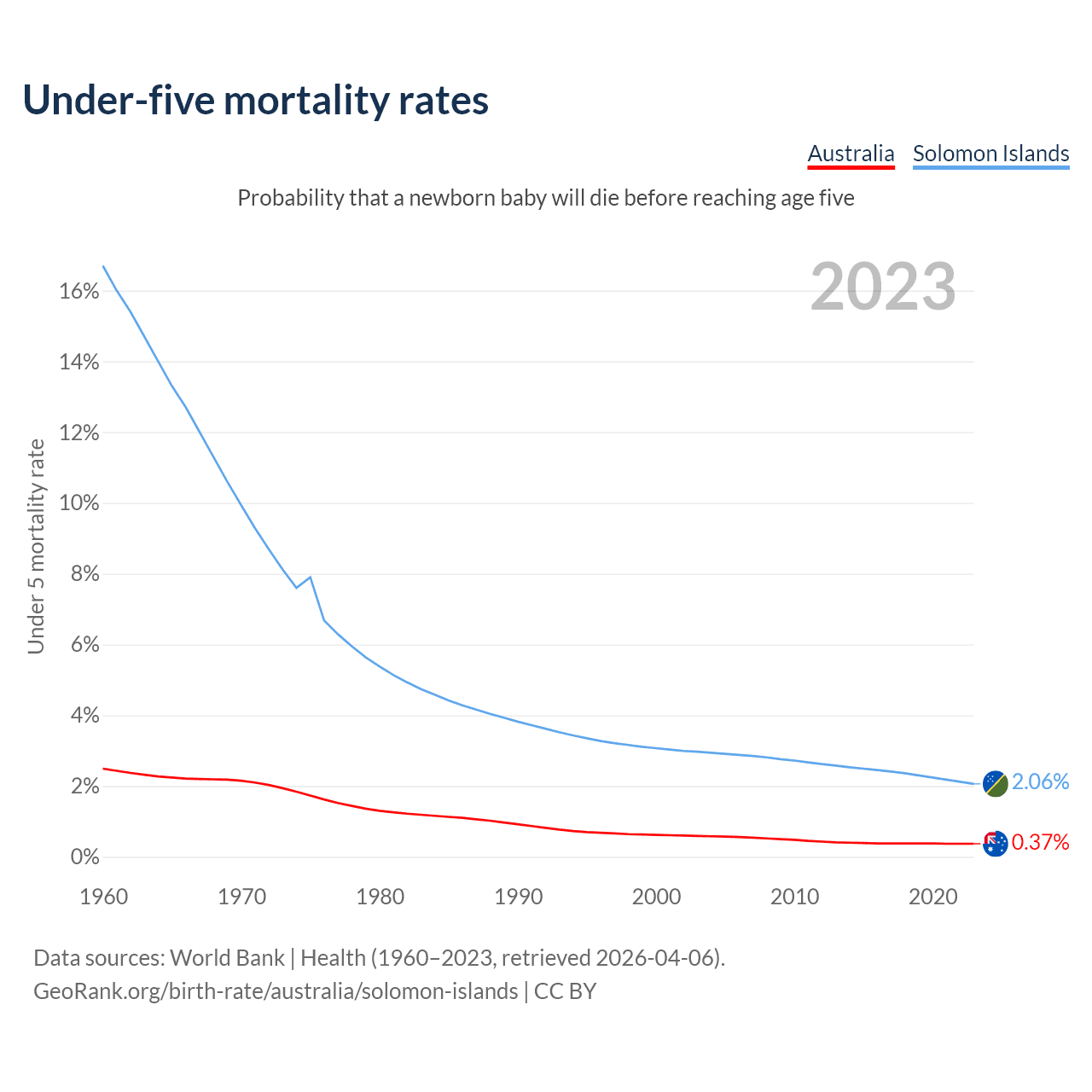 The chance that a newborn baby will die before reaching age five is 0.37% in Australia and 2.06% in the Solomon Islands. Above is a chart with historical data on under-five mortality rates.