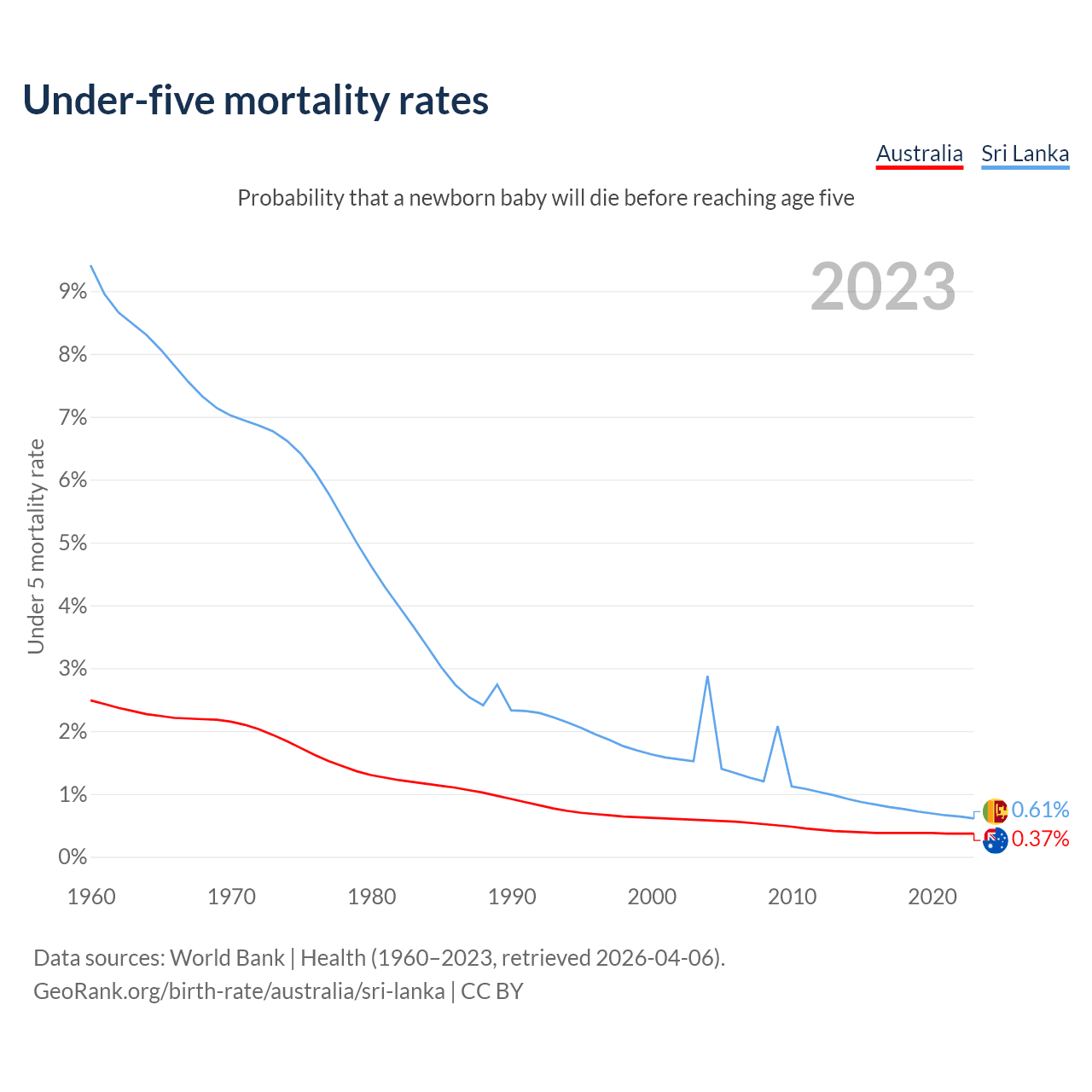 The chance that a newborn baby will die before reaching age five is 0.37% in Australia and 0.61% in Sri Lanka. Above is a chart with historical data on under-five mortality rates.