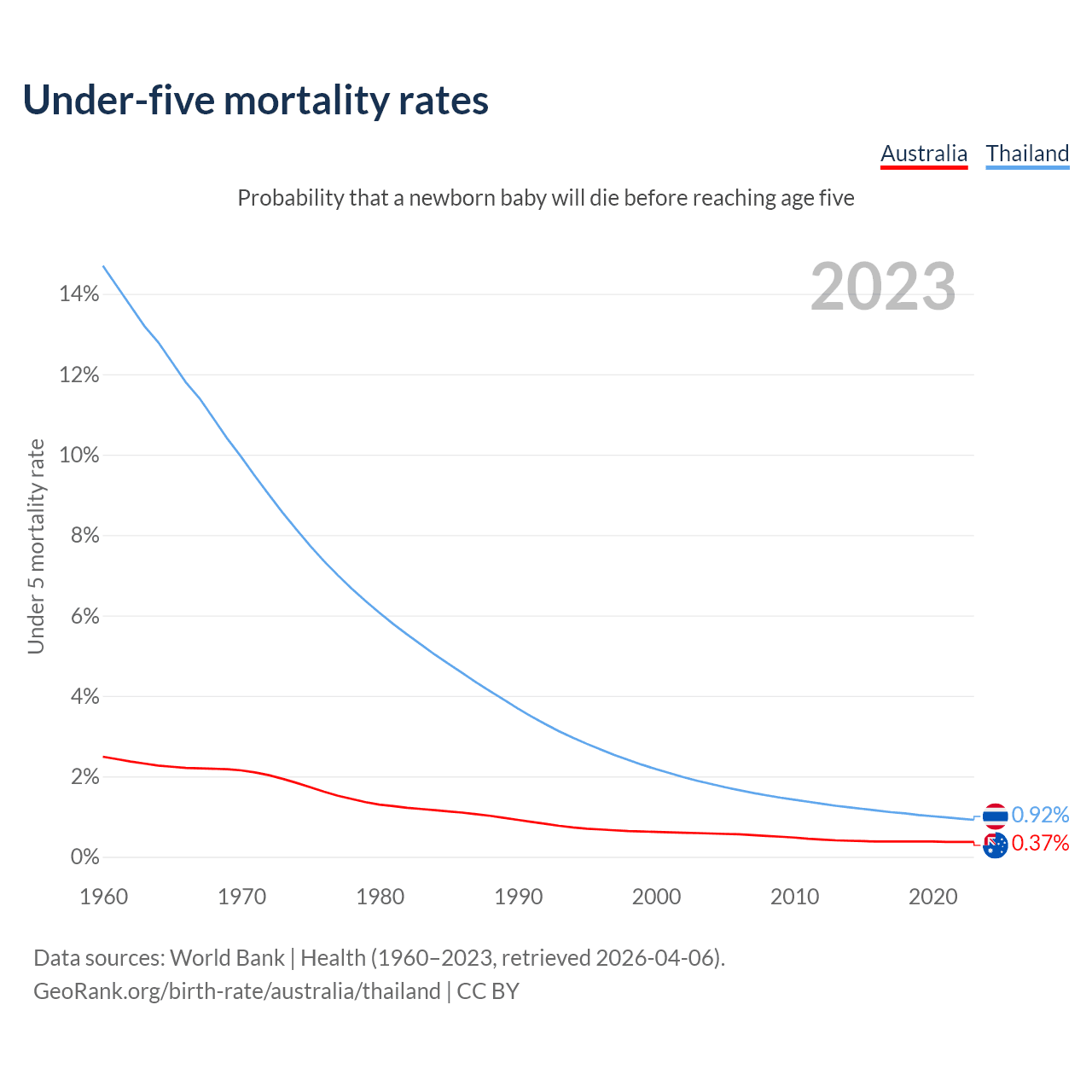 The chance that a newborn baby will die before reaching age five is 0.37% in Australia and 0.92% in Thailand. Above is a chart with historical data on under-five mortality rates.