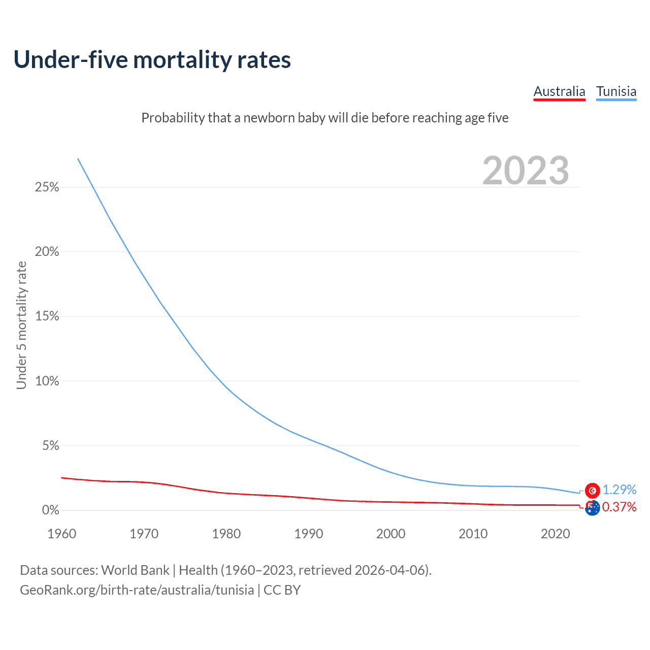 The chance that a newborn baby will die before reaching age five is 0.37% in Australia and 1.29% in Tunisia. Above is a chart with historical data on under-five mortality rates.
