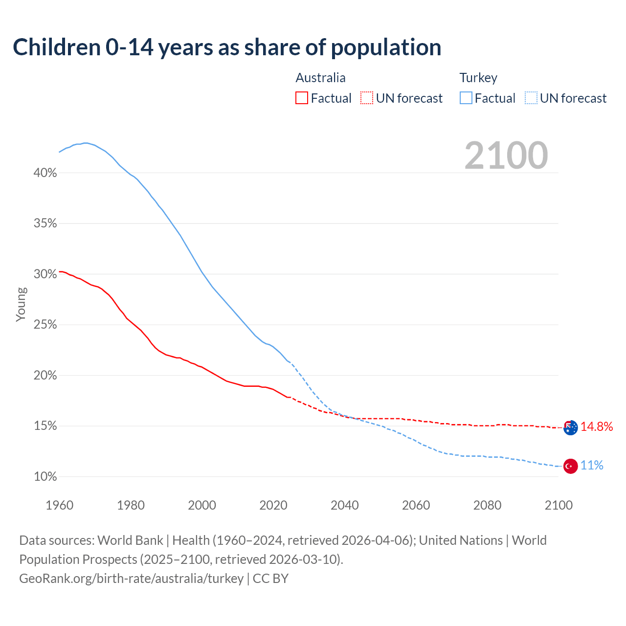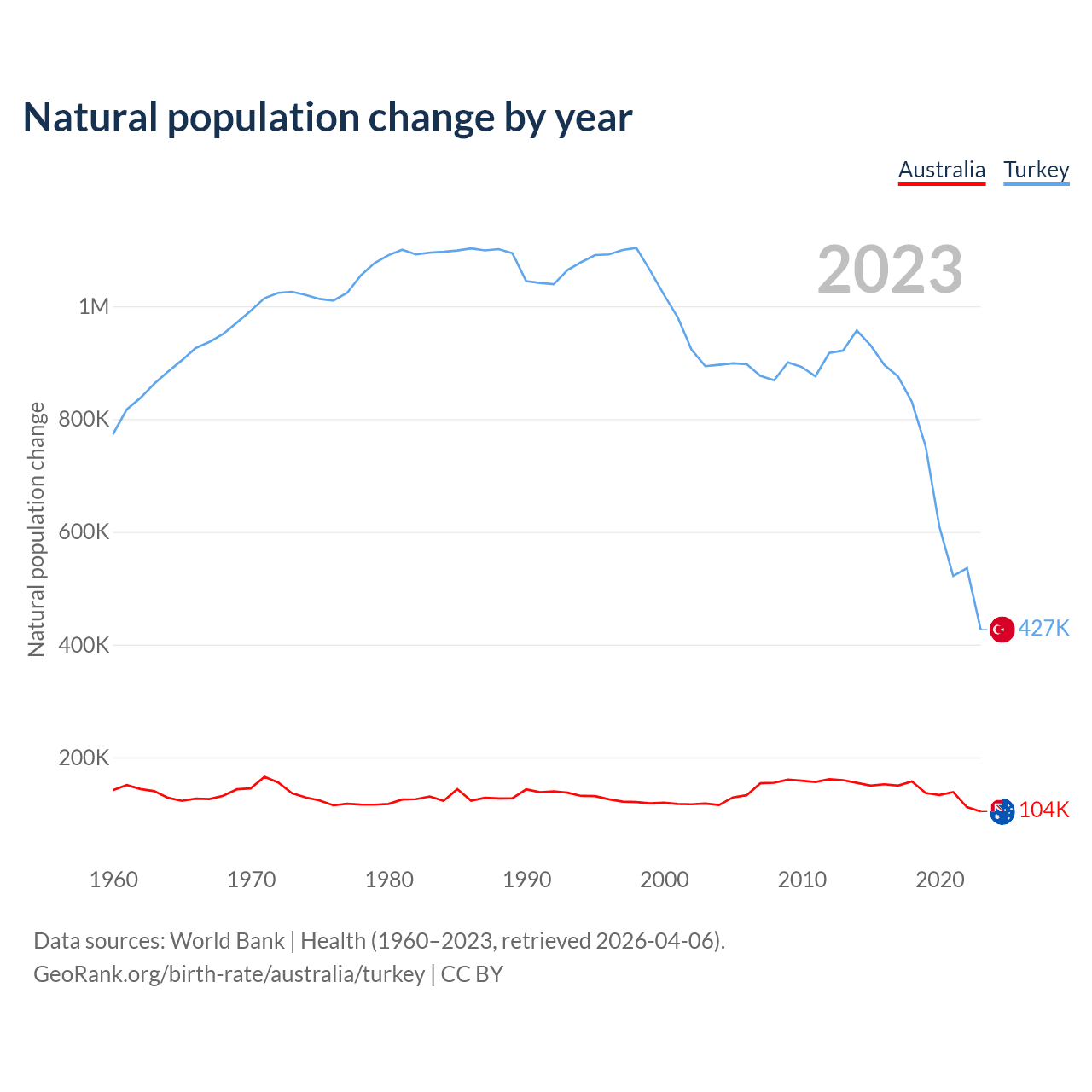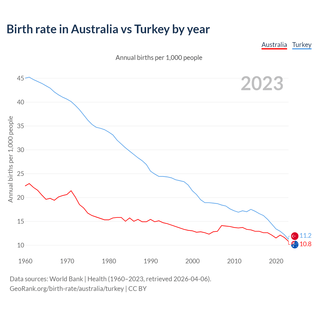 According to the latest available data on birth rates, the fertility rate in Australia was 1.5 children per woman in 2023, compared to 1.51 in Turkey in 2023. The replacement level is considered to be 2.1 children per woman.