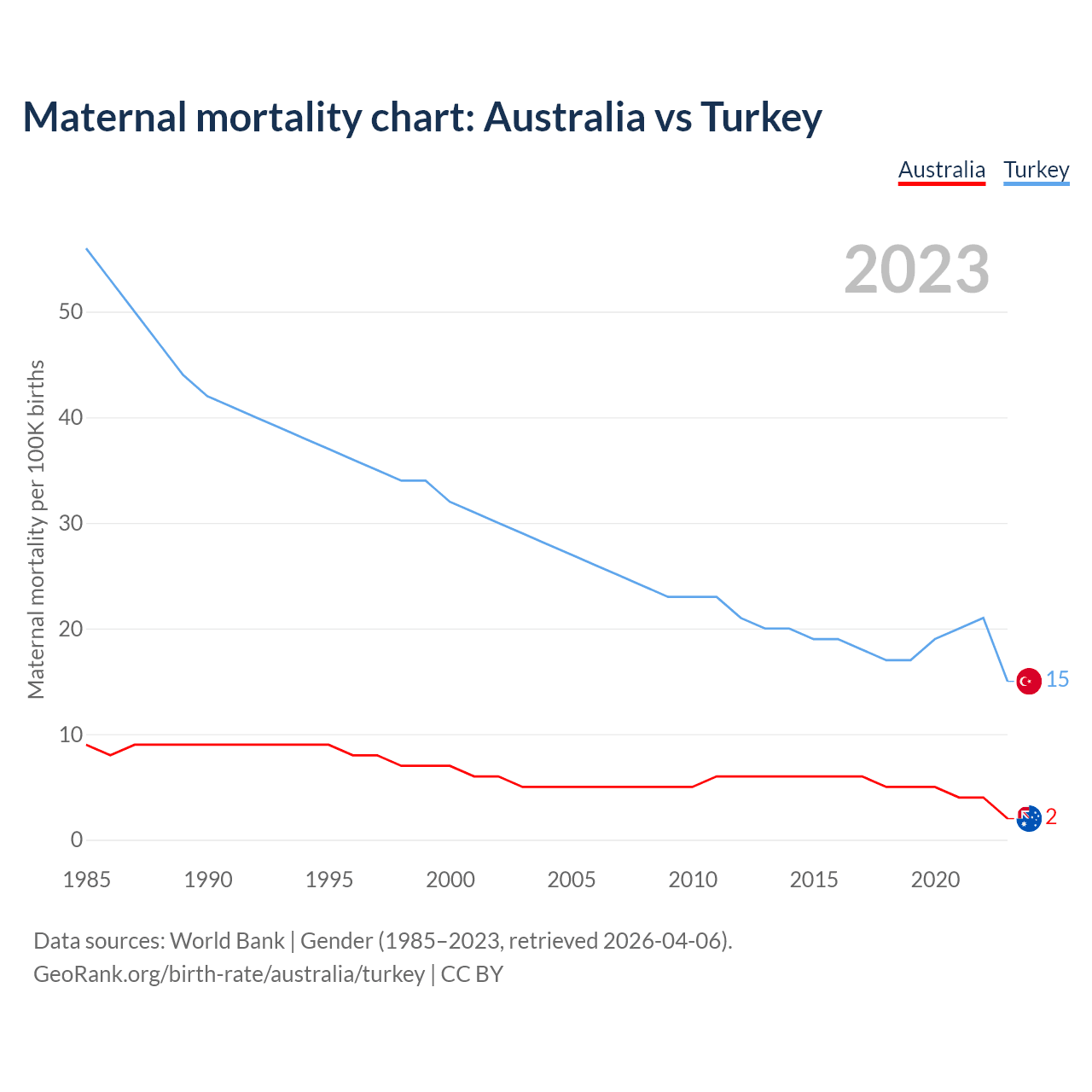 The maternal mortality rate, which is the probability of dying during childbirth or within 42 days of pregnancy termination, is 2 deaths per 100,000 live births in Australia, compared to 15 deaths in Turkey.
