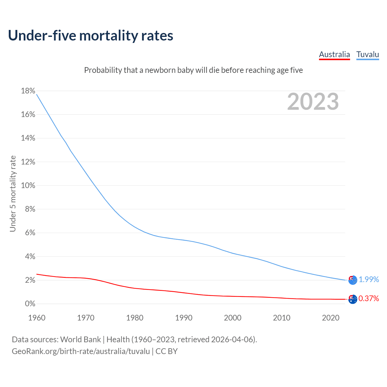 The chance that a newborn baby will die before reaching age five is 0.37% in Australia and 1.99% in Tuvalu. Above is a chart with historical data on under-five mortality rates.