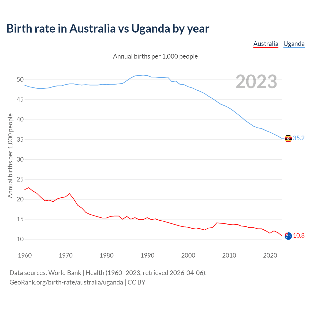 Australia has an annual birth rate of 10.8 births per 1,000 people, compared to 35.2 for Uganda. The average number of children a woman is expected to have during her lifetime — the fertility rate, is 1.5 in Australia and 4.28 in Uganda — 185.5% difference.