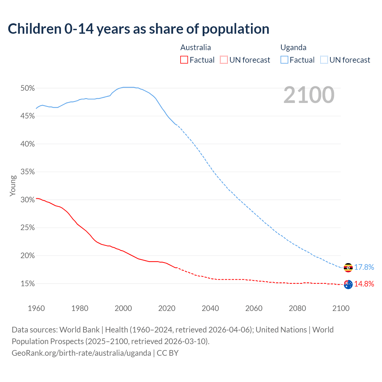 According to the latest available data on birth rates, the fertility rate in Australia was 1.5 children per woman in 2023, compared to 4.28 in Uganda in 2023. The replacement level is considered to be 2.1 children per woman.