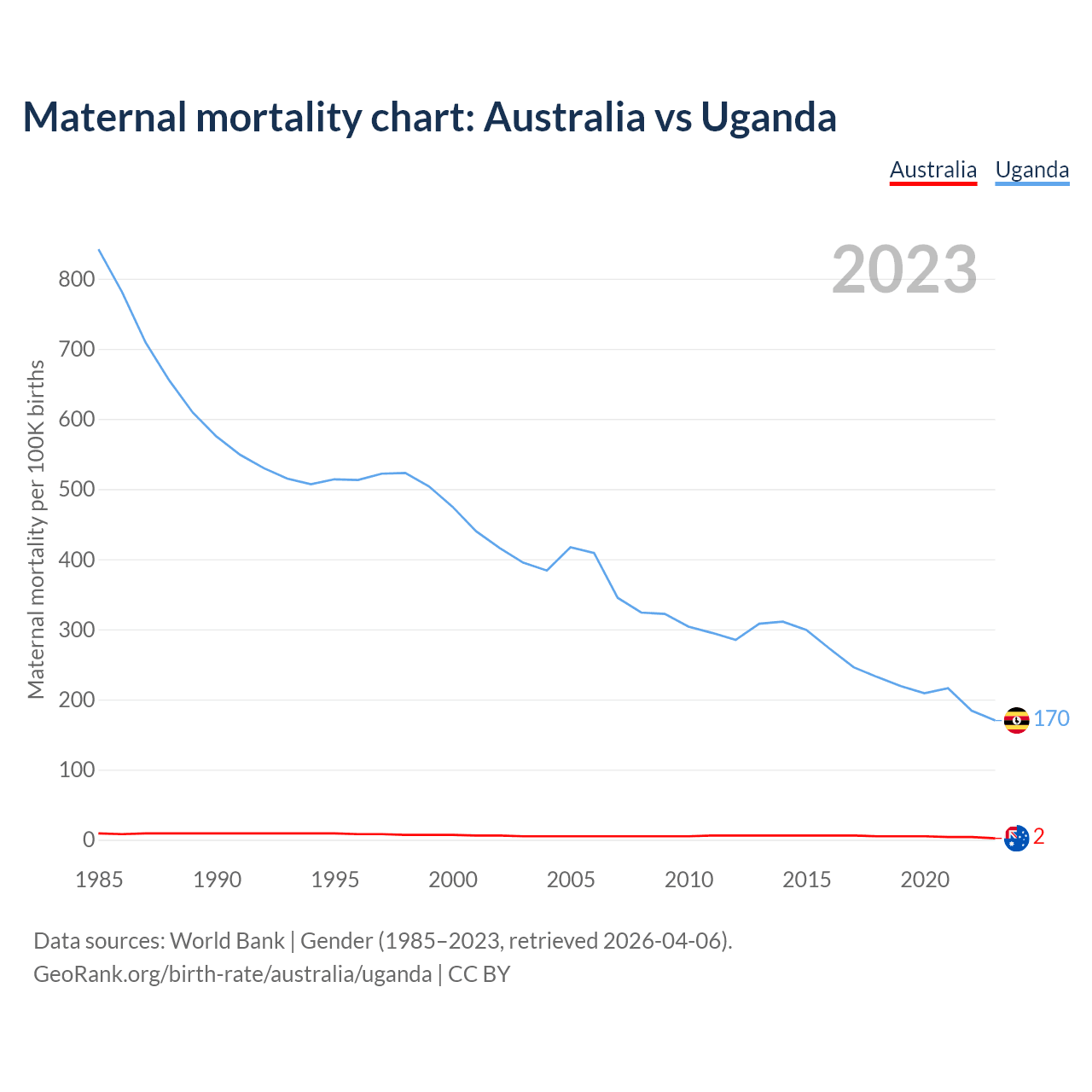 The maternal mortality rate, which is the probability of dying during childbirth or within 42 days of pregnancy termination, is 2 deaths per 100,000 live births in Australia, compared to 170 deaths in Uganda.