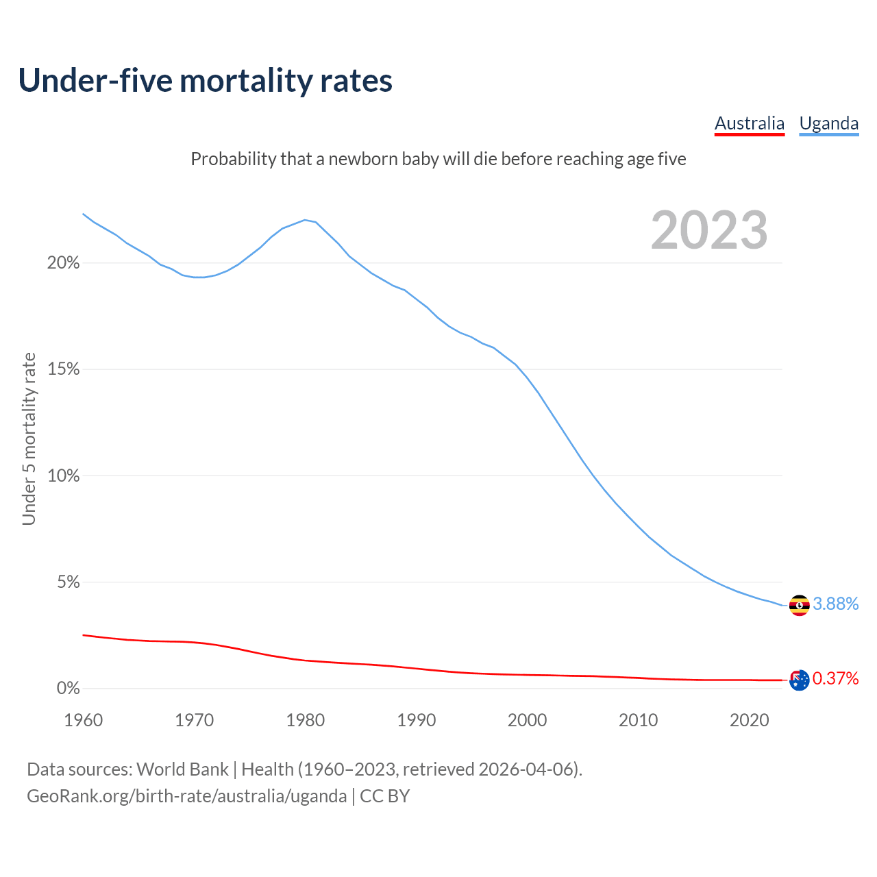 The chance that a newborn baby will die before reaching age five is 0.37% in Australia and 3.88% in Uganda. Above is a chart with historical data on under-five mortality rates.