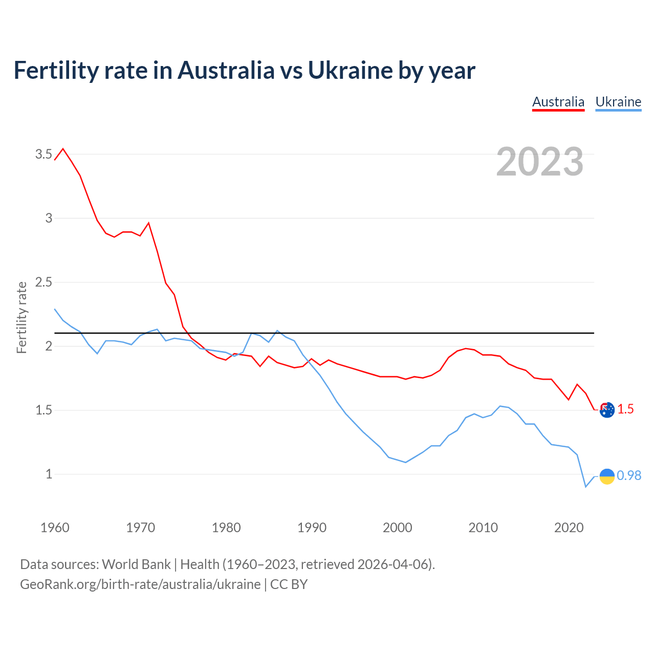 According to the latest available data on birth rates, the fertility rate in Australia was 1.5 children per woman in 2023, compared to 0.98 in Ukraine in 2023. The replacement level is considered to be 2.1 children per woman.