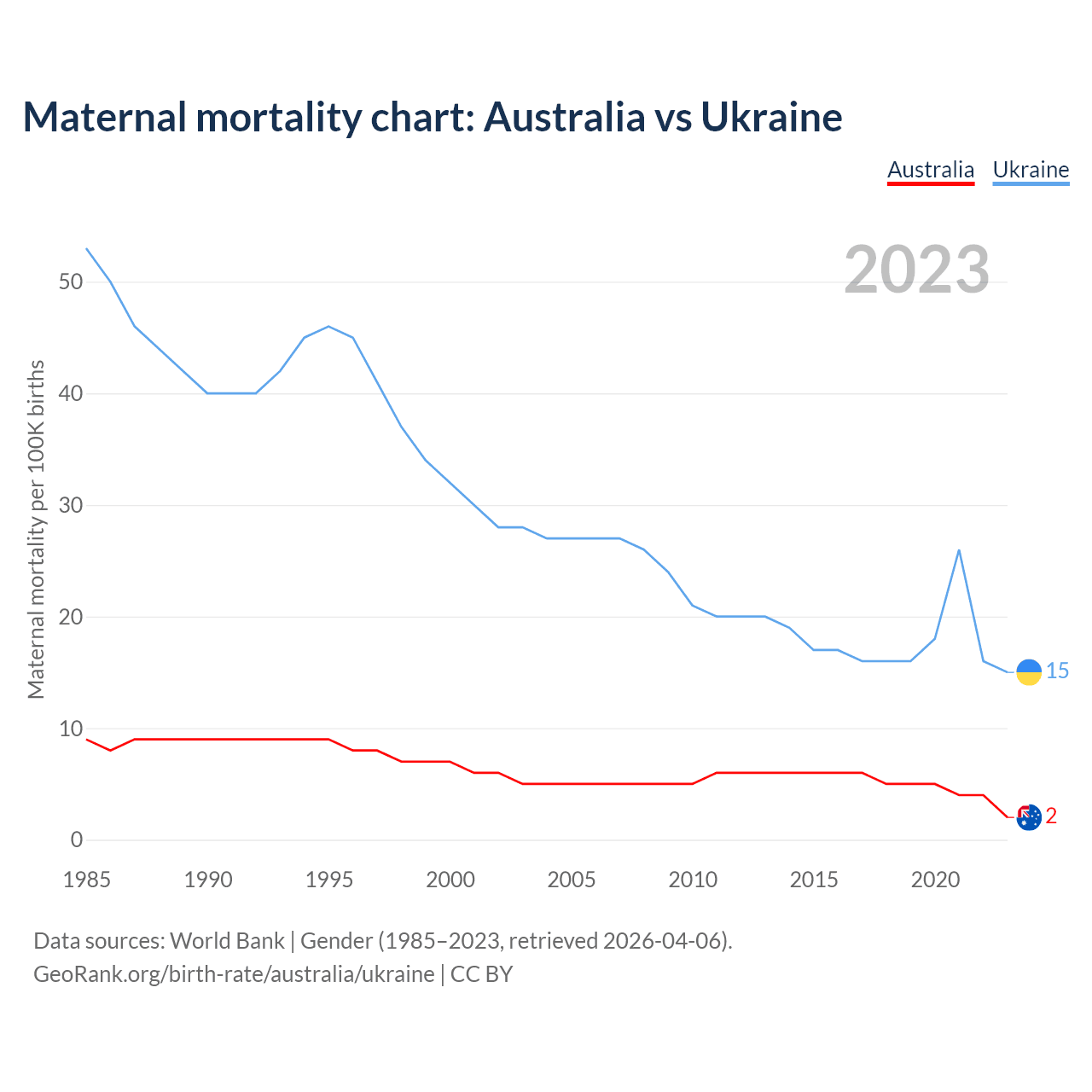 The maternal mortality rate, which is the probability of dying during childbirth or within 42 days of pregnancy termination, is 2 deaths per 100,000 live births in Australia, compared to 15 deaths in Ukraine.