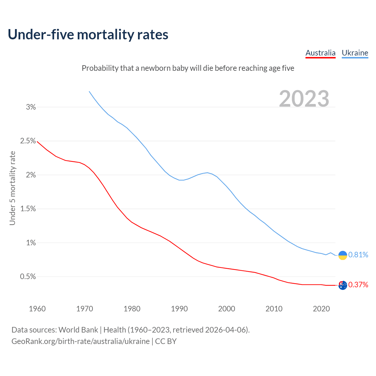 The chance that a newborn baby will die before reaching age five is 0.37% in Australia and 0.81% in Ukraine. Above is a chart with historical data on under-five mortality rates.