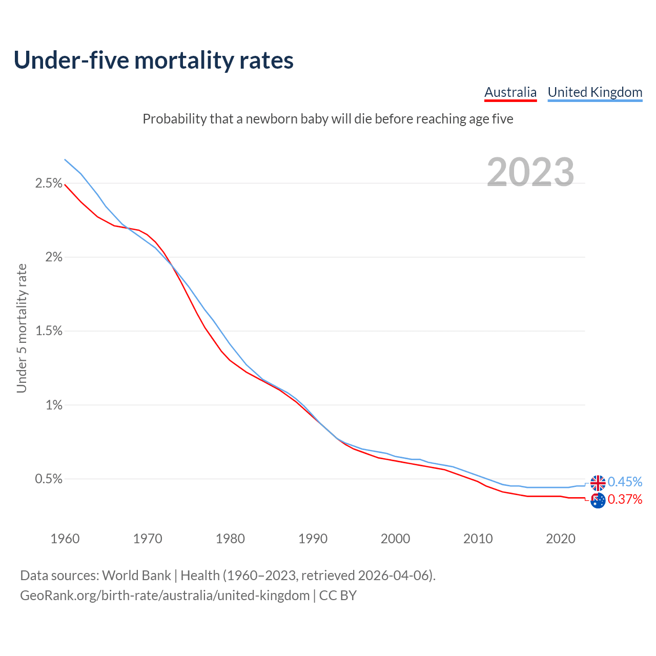 The chance that a newborn baby will die before reaching age five is 0.37% in Australia and 0.45% in the United Kingdom. Above is a chart with historical data on under-five mortality rates.