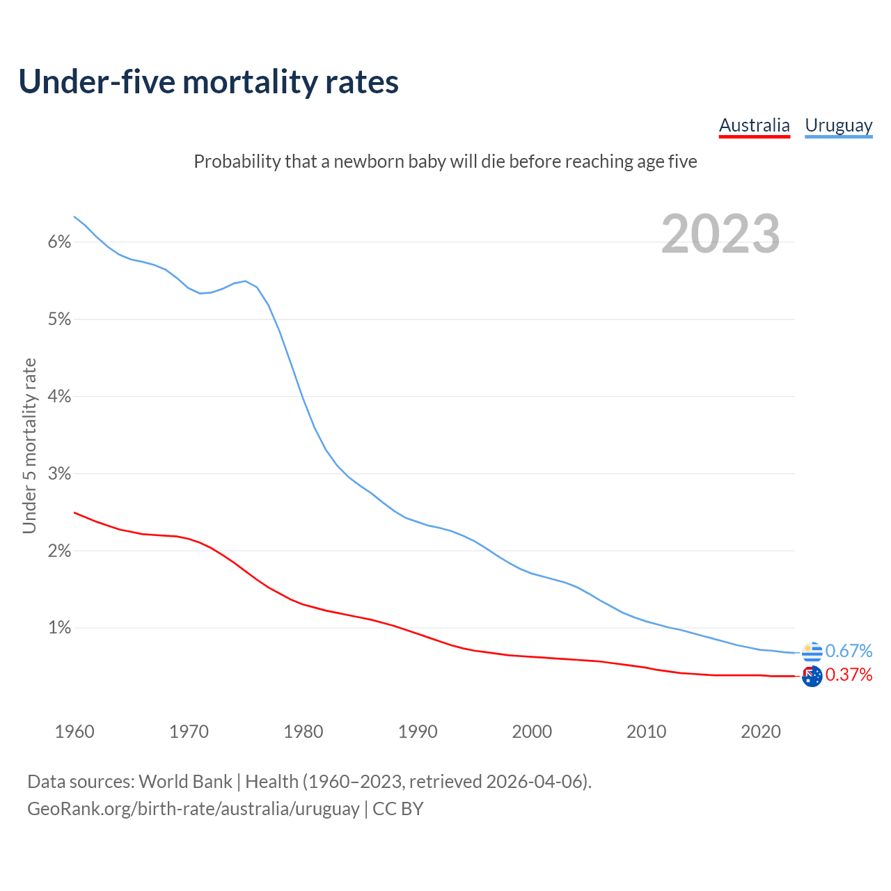 The chance that a newborn baby will die before reaching age five is 0.37% in Australia and 0.67% in Uruguay. Above is a chart with historical data on under-five mortality rates.