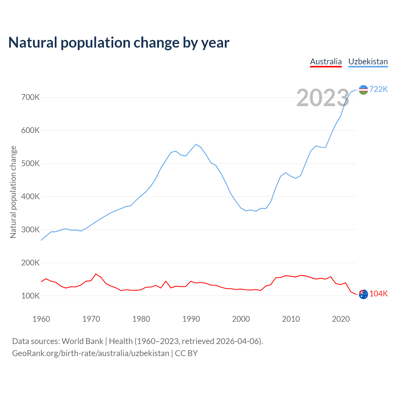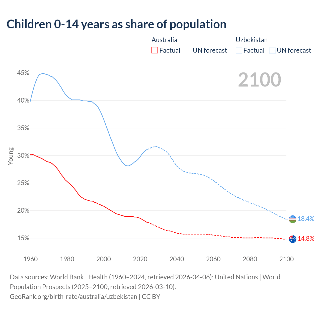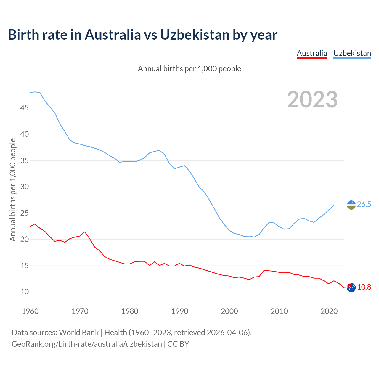 Australia has an annual birth rate of 10.8 births per 1,000 people, compared to 26.5 for Uzbekistan. The average number of children a woman is expected to have during her lifetime — the fertility rate, is 1.5 in Australia and 3.5 in Uzbekistan — 133.3% difference.