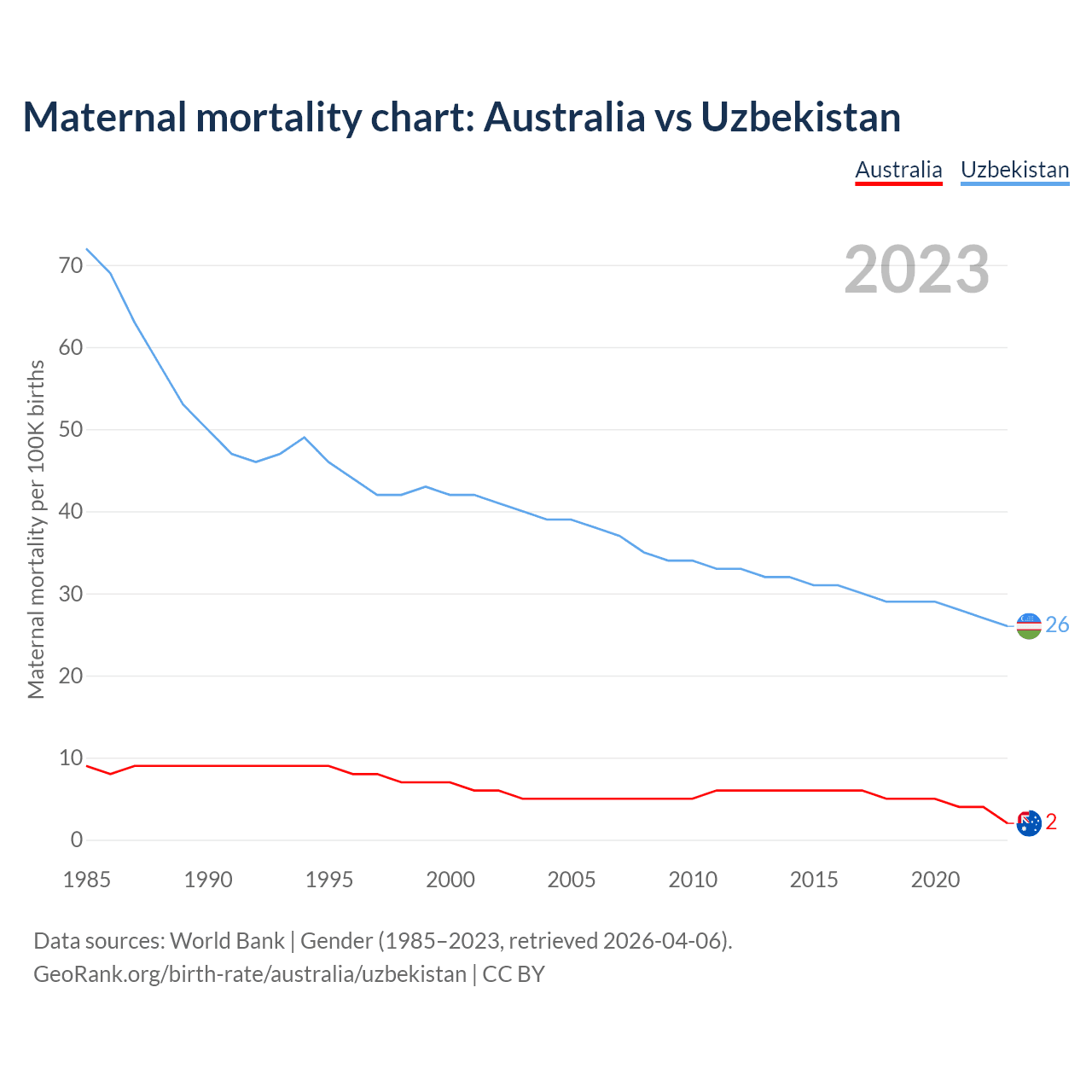 The maternal mortality rate, which is the probability of dying during childbirth or within 42 days of pregnancy termination, is 2 deaths per 100,000 live births in Australia, compared to 26 deaths in Uzbekistan.
