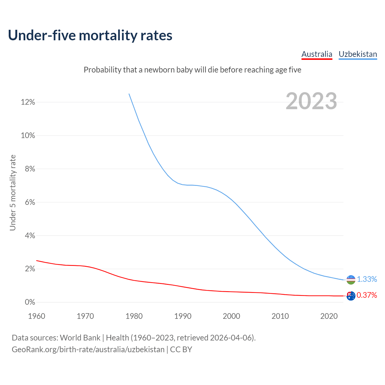 The chance that a newborn baby will die before reaching age five is 0.37% in Australia and 1.33% in Uzbekistan. Above is a chart with historical data on under-five mortality rates.