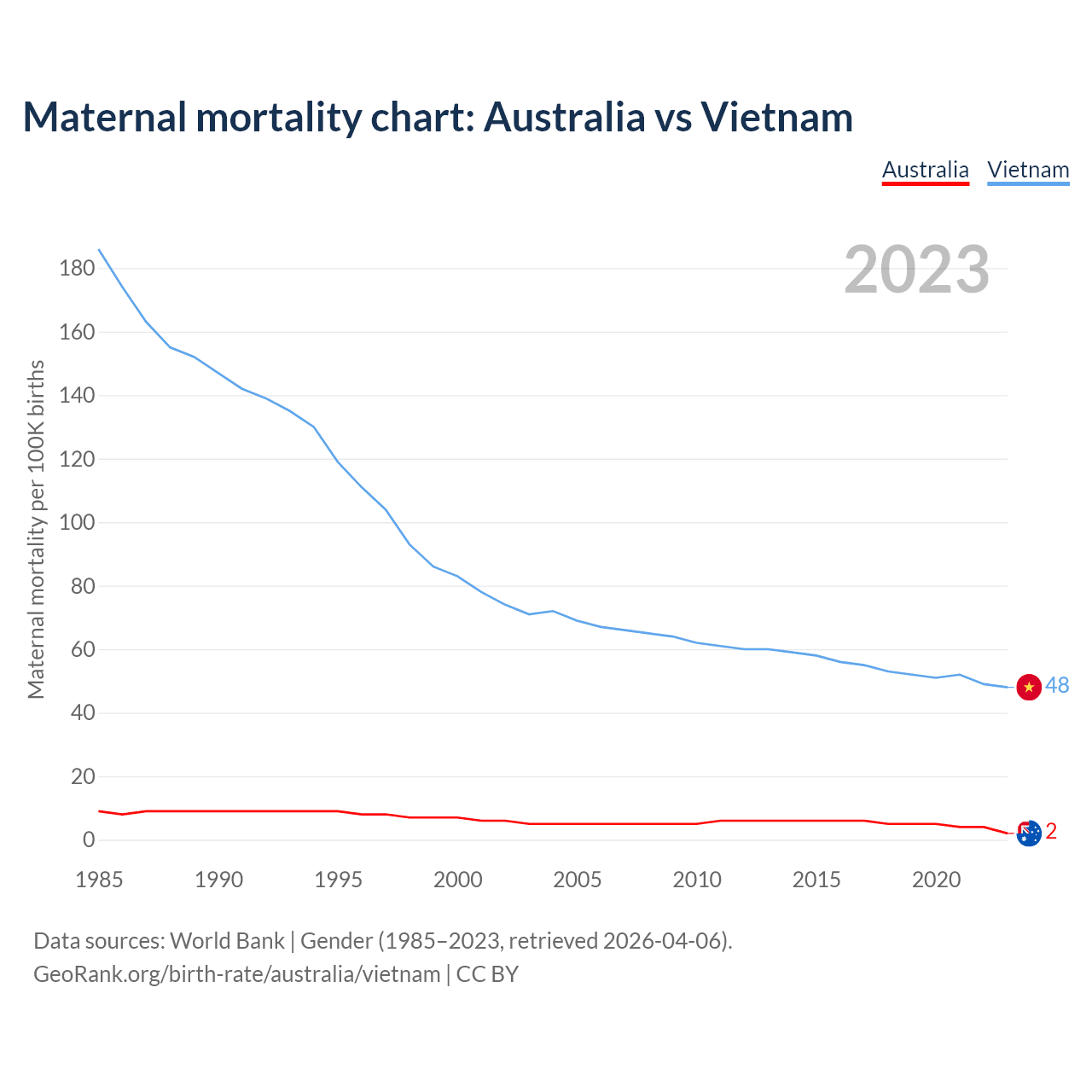 The maternal mortality rate, which is the probability of dying during childbirth or within 42 days of pregnancy termination, is 2 deaths per 100,000 live births in Australia, compared to 48 deaths in Vietnam.