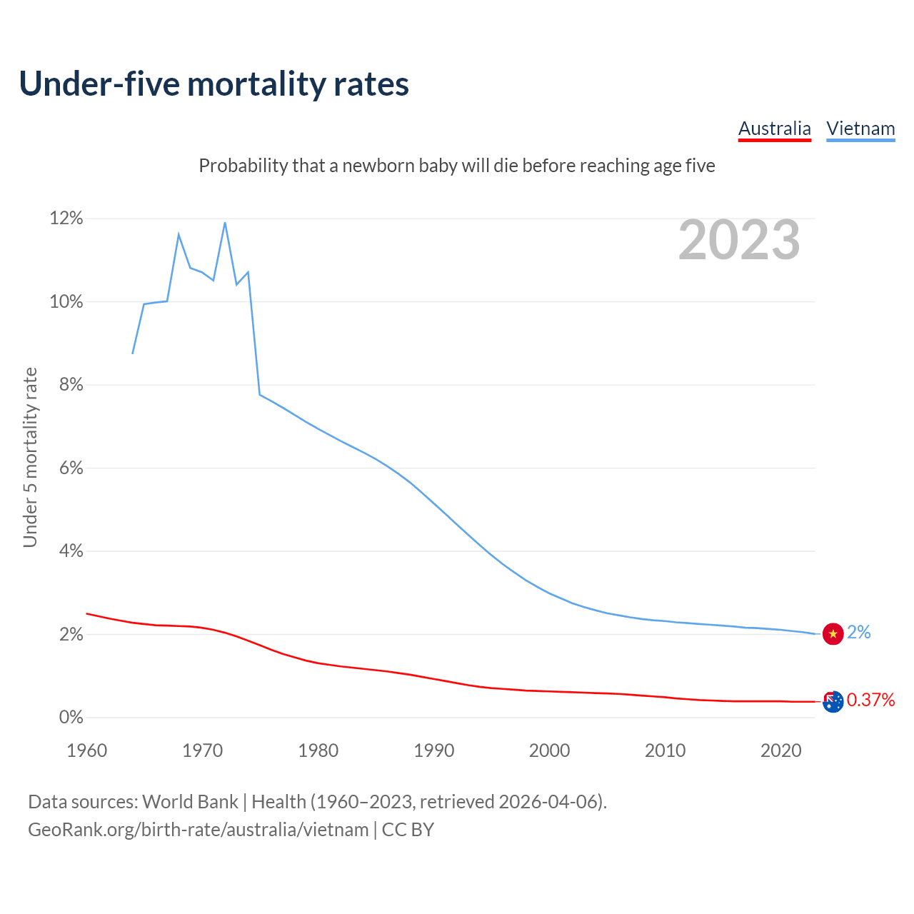 The chance that a newborn baby will die before reaching age five is 0.37% in Australia and 2% in Vietnam. Above is a chart with historical data on under-five mortality rates.