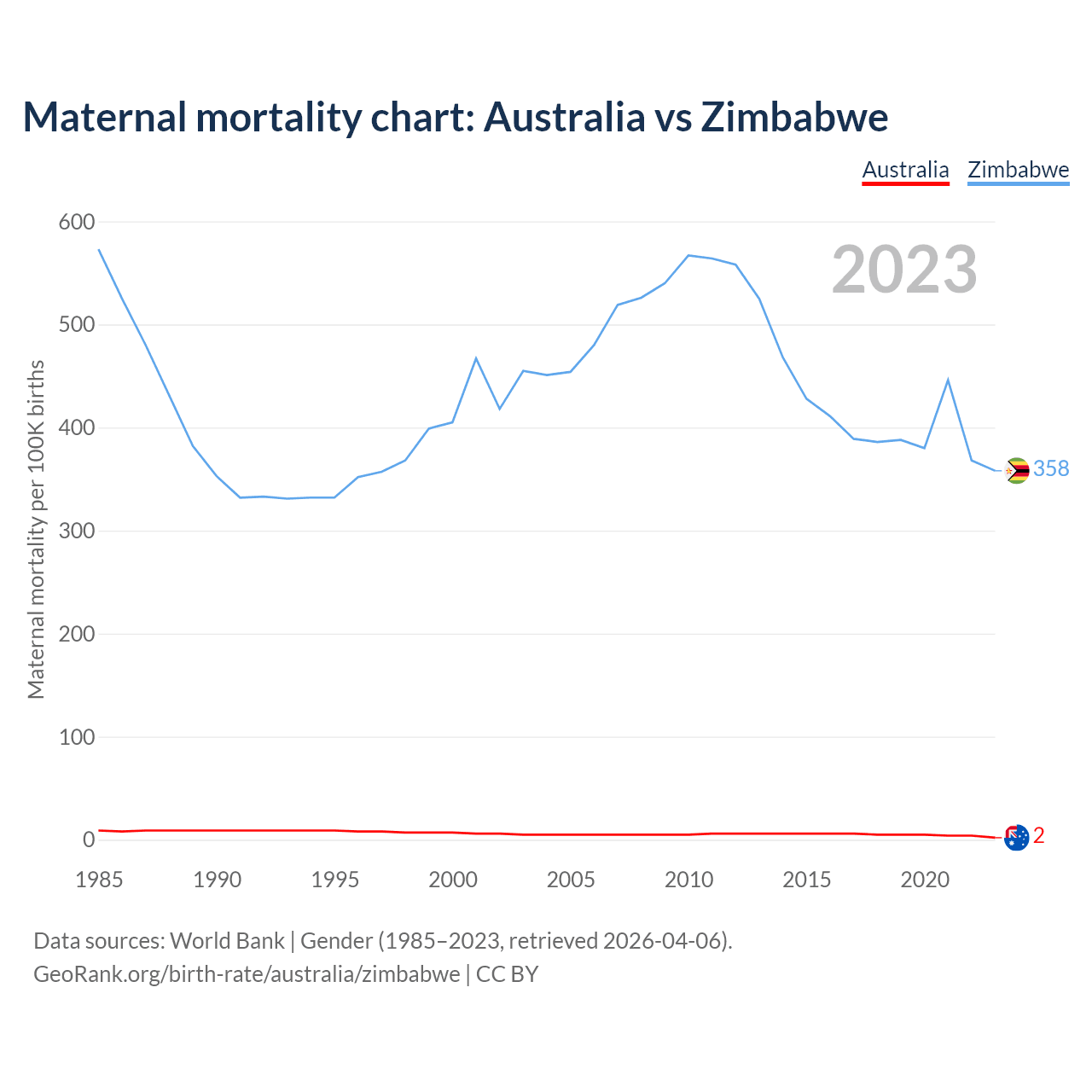 The maternal mortality rate, which is the probability of dying during childbirth or within 42 days of pregnancy termination, is 2 deaths per 100,000 live births in Australia, compared to 358 deaths in Zimbabwe.