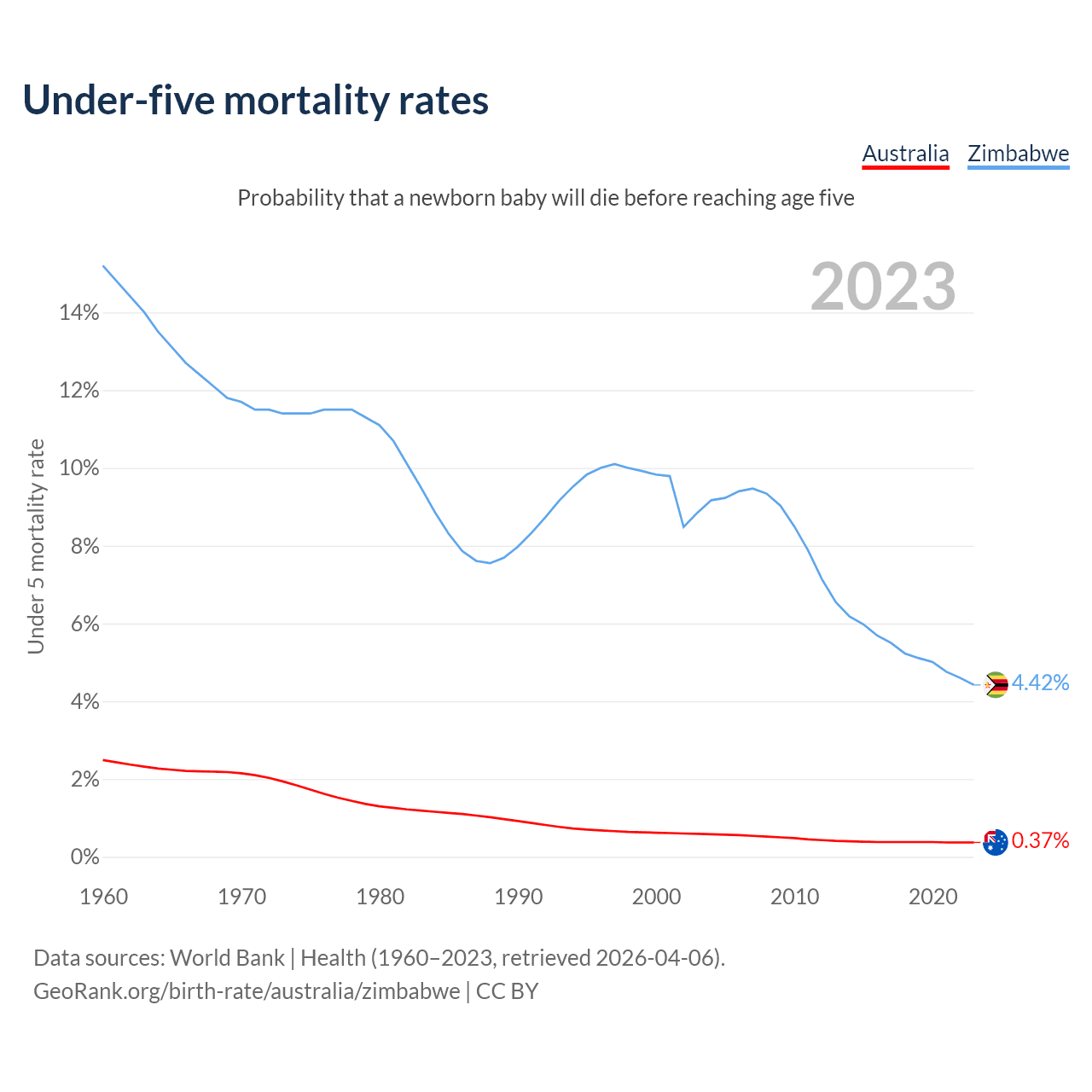 The chance that a newborn baby will die before reaching age five is 0.37% in Australia and 4.42% in Zimbabwe. Above is a chart with historical data on under-five mortality rates.