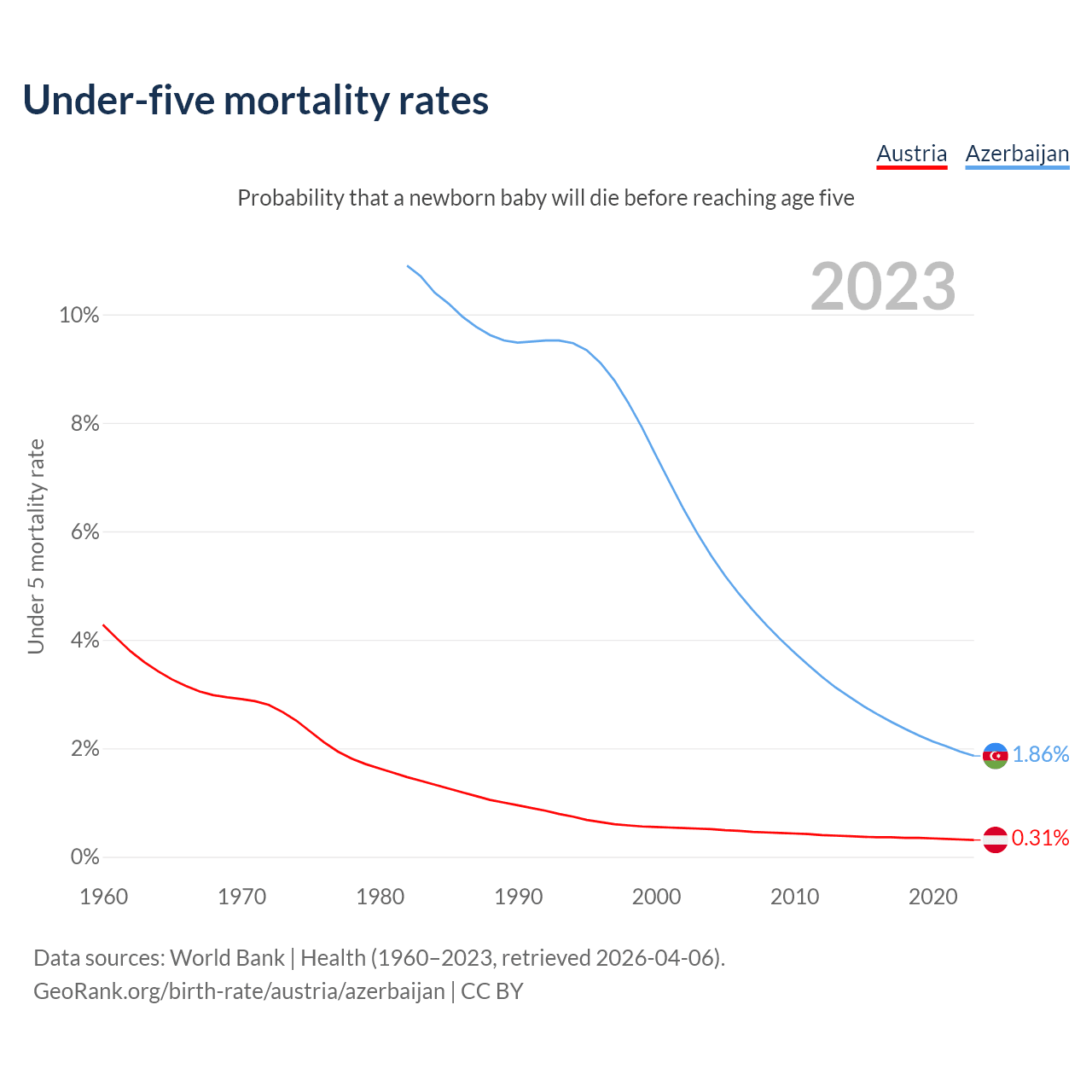 The chance that a newborn baby will die before reaching age five is 0.31% in Austria and 1.86% in Azerbaijan. Above is a chart with historical data on under-five mortality rates.