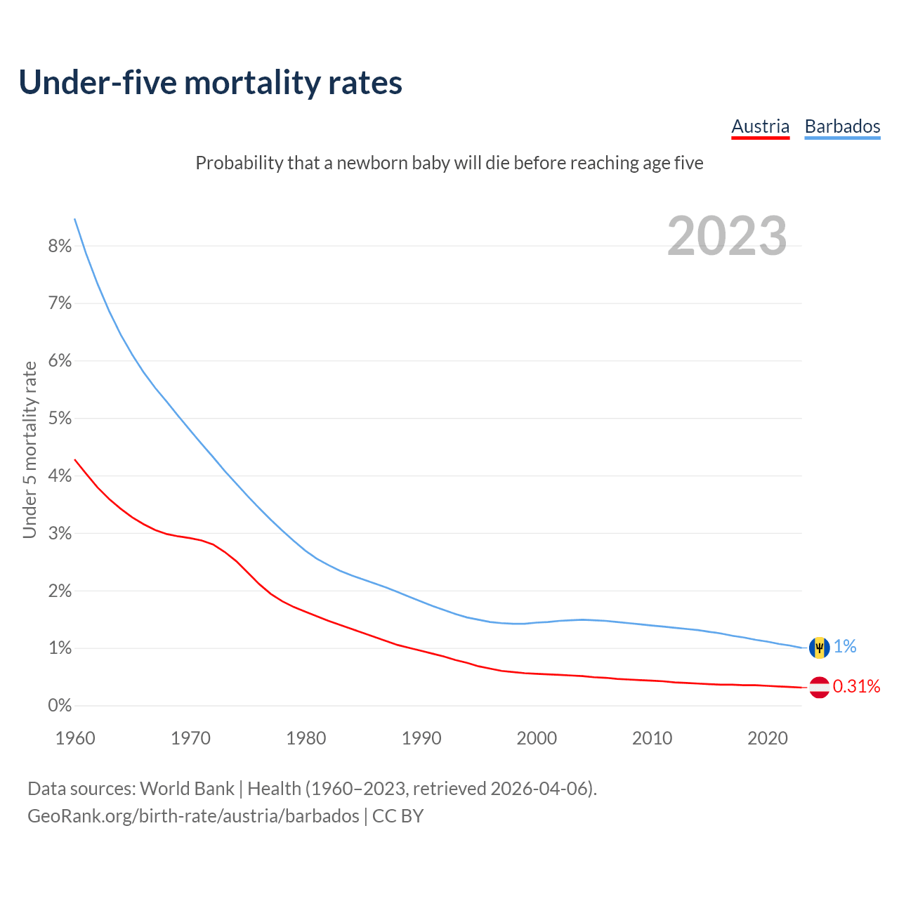 The chance that a newborn baby will die before reaching age five is 0.31% in Austria and 1% in Barbados. Above is a chart with historical data on under-five mortality rates.
