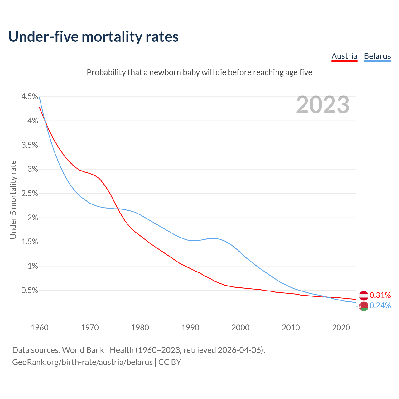 The chance that a newborn baby will die before reaching age five is 0.31% in Austria and 0.24% in Belarus. Above is a chart with historical data on under-five mortality rates.