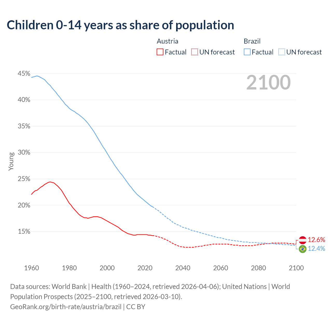 According to the latest available data on birth rates, the fertility rate in Austria was 1.32 children per woman in 2023, compared to 1.62 in Brazil in 2023. The replacement level is considered to be 2.1 children per woman.