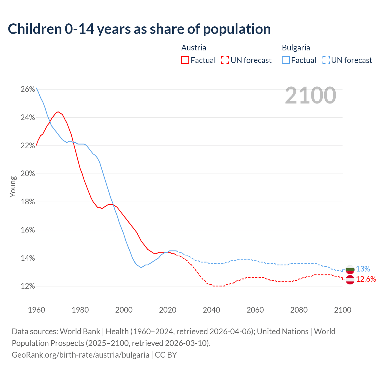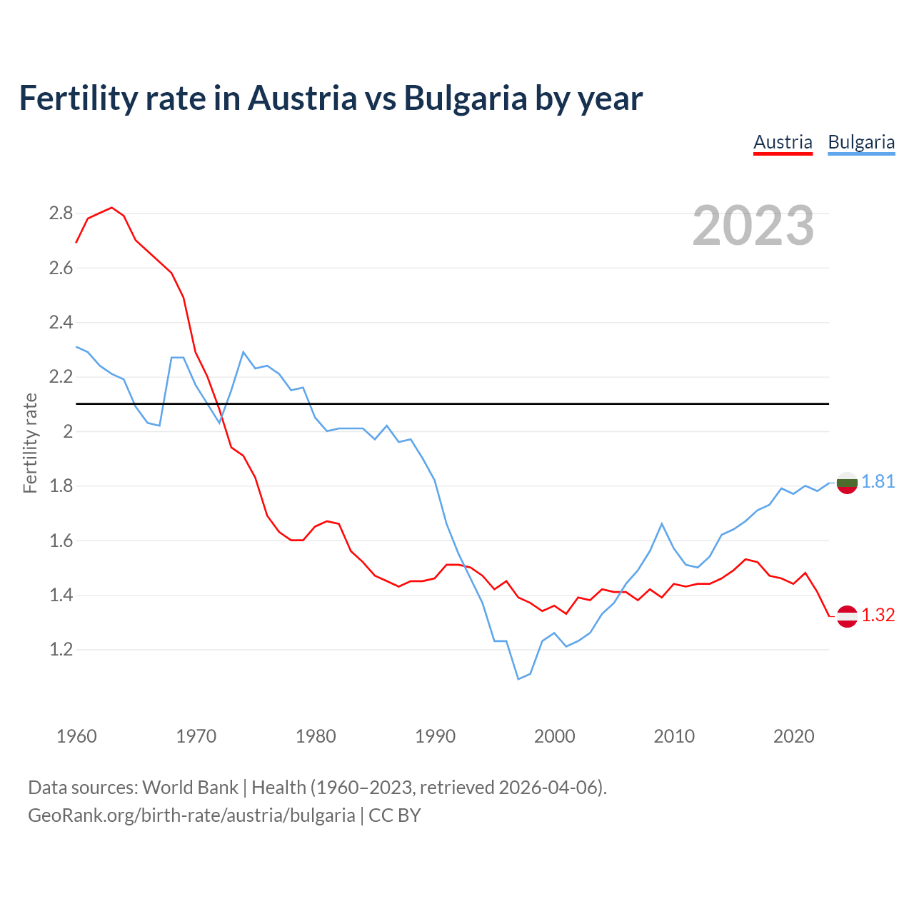 According to the latest available data on birth rates, the fertility rate in Austria was 1.32 children per woman in 2023, compared to 1.81 in Bulgaria in 2023. The replacement level is considered to be 2.1 children per woman.
