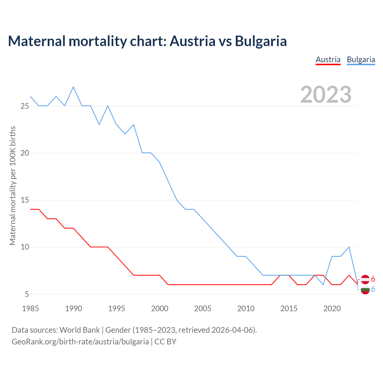 The maternal mortality rate, which is the probability of dying during childbirth or within 42 days of pregnancy termination, is 6 deaths per 100,000 live births in Austria, compared to 6 deaths in Bulgaria.