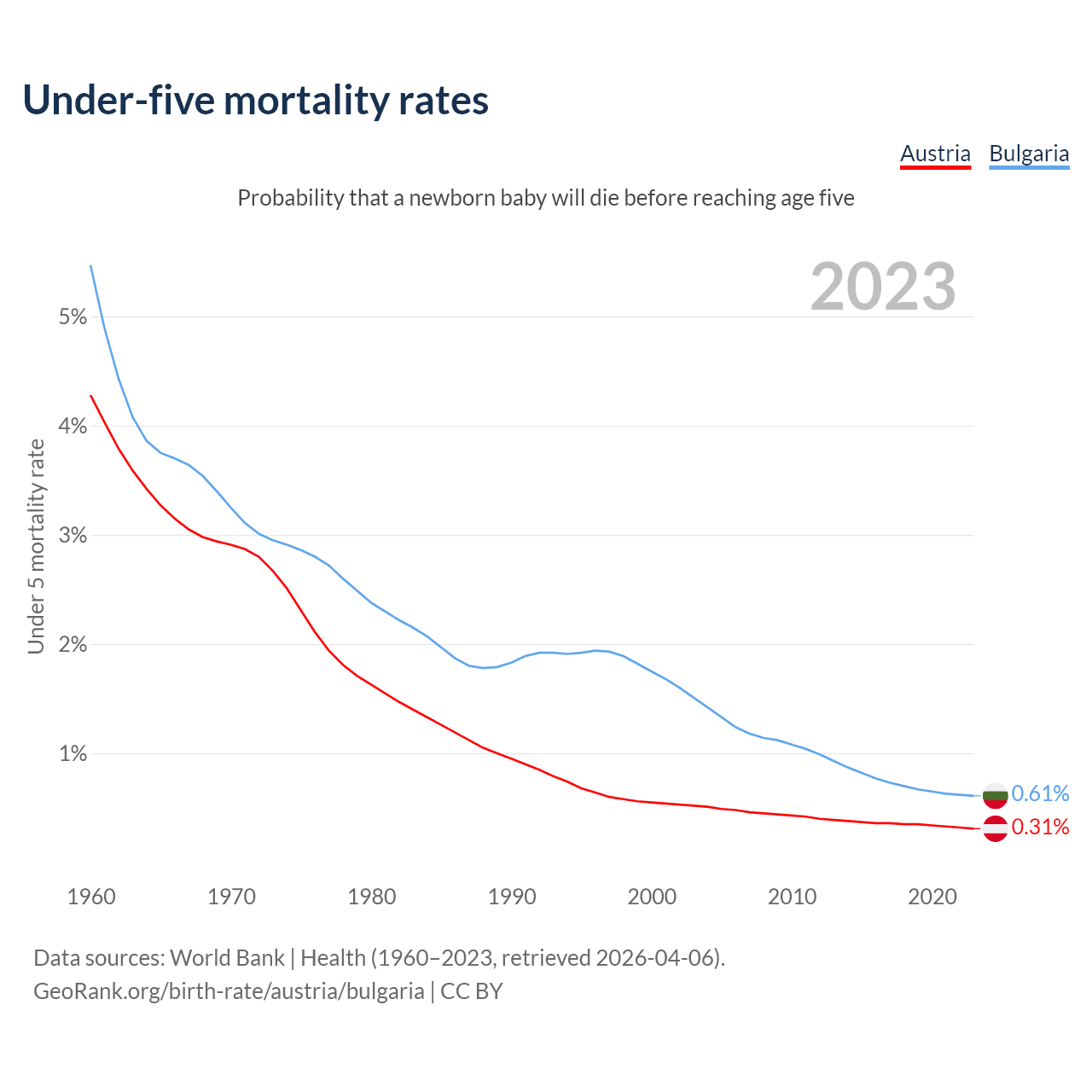 The chance that a newborn baby will die before reaching age five is 0.31% in Austria and 0.61% in Bulgaria. Above is a chart with historical data on under-five mortality rates.