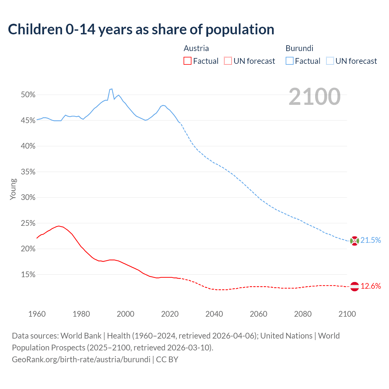 According to the latest available data on birth rates, the fertility rate in Austria was 1.32 children per woman in 2023, compared to 4.88 in Burundi in 2023. The replacement level is considered to be 2.1 children per woman.