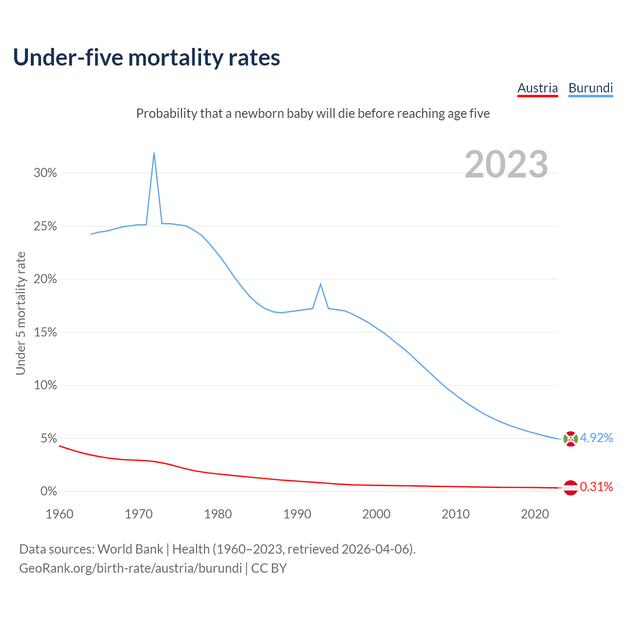 The chance that a newborn baby will die before reaching age five is 0.31% in Austria and 4.92% in Burundi. Above is a chart with historical data on under-five mortality rates.