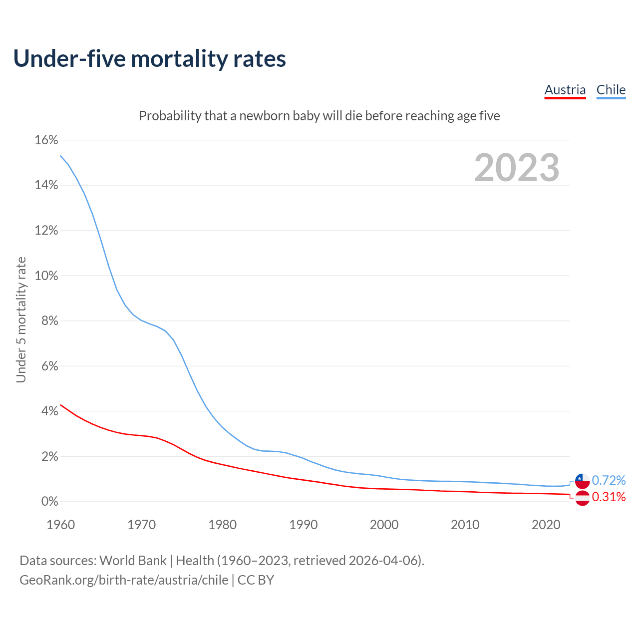 The chance that a newborn baby will die before reaching age five is 0.31% in Austria and 0.72% in Chile. Above is a chart with historical data on under-five mortality rates.