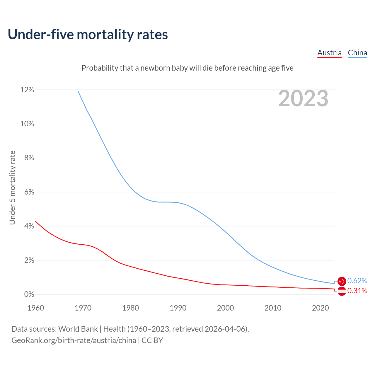 The chance that a newborn baby will die before reaching age five is 0.31% in Austria and 0.62% in China. Above is a chart with historical data on under-five mortality rates.