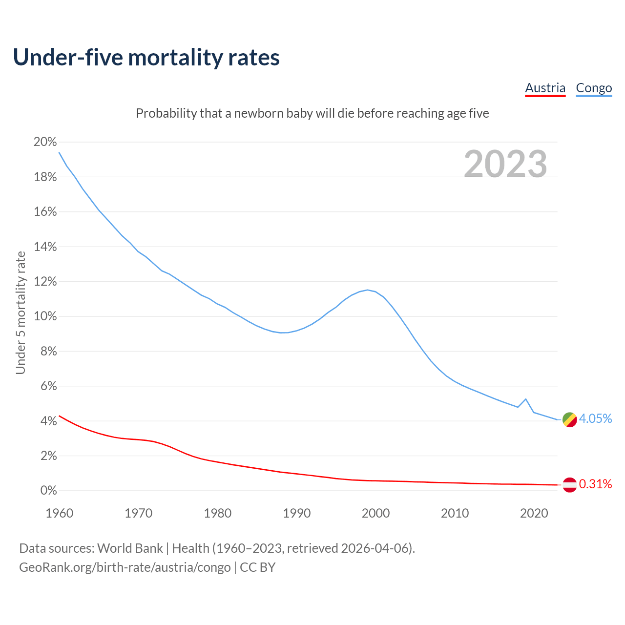 The chance that a newborn baby will die before reaching age five is 0.31% in Austria and 4.05% in the Congo. Above is a chart with historical data on under-five mortality rates.