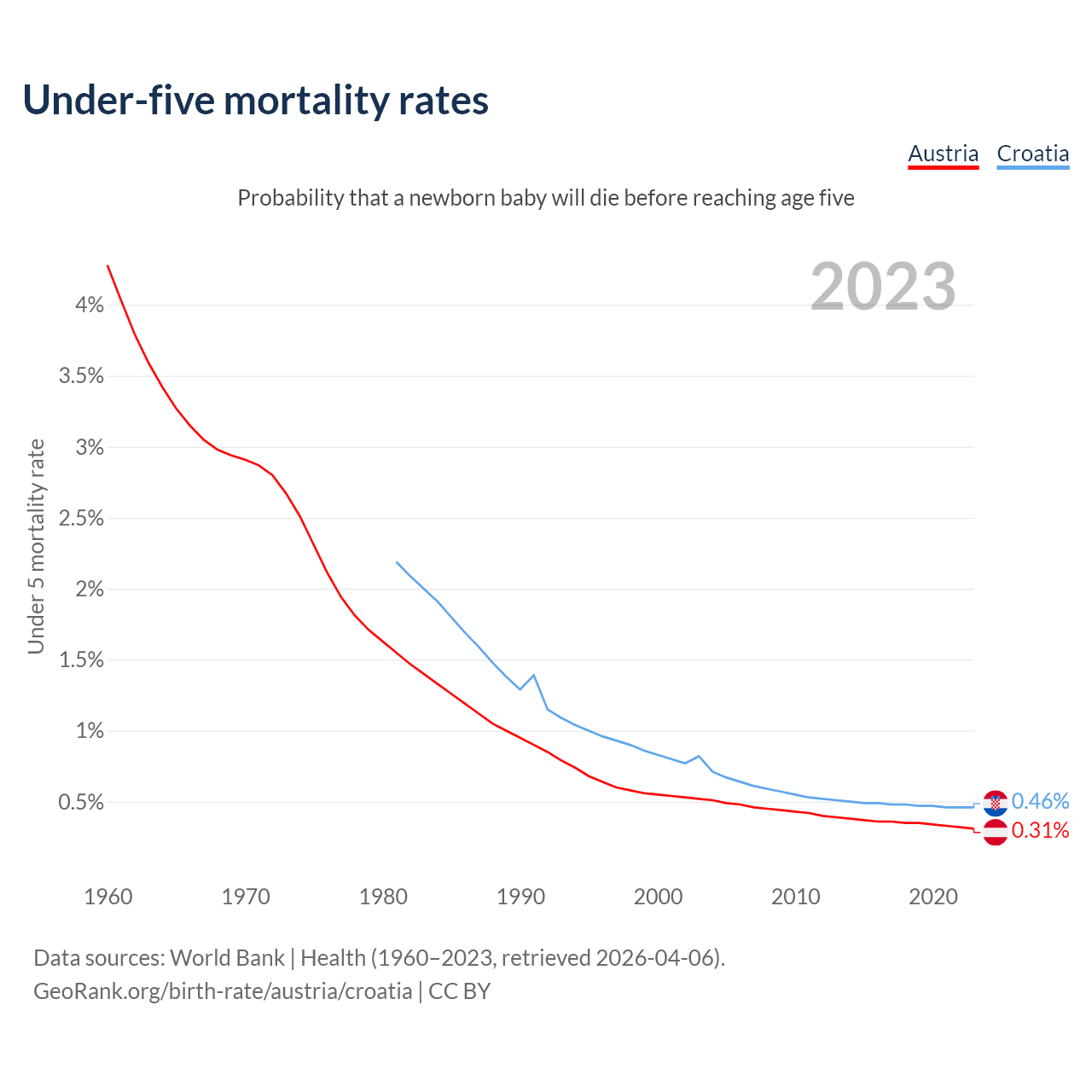 The chance that a newborn baby will die before reaching age five is 0.31% in Austria and 0.46% in Croatia. Above is a chart with historical data on under-five mortality rates.