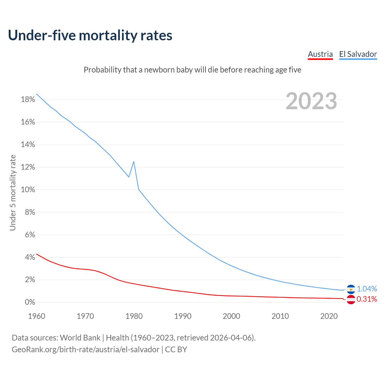 The chance that a newborn baby will die before reaching age five is 0.31% in Austria and 1.04% in El Salvador. Above is a chart with historical data on under-five mortality rates.