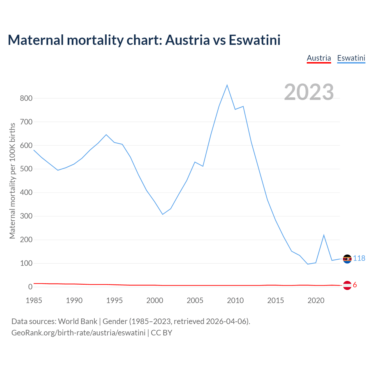 The maternal mortality rate, which is the probability of dying during childbirth or within 42 days of pregnancy termination, is 6 deaths per 100,000 live births in Austria, compared to 118 deaths in Eswatini.