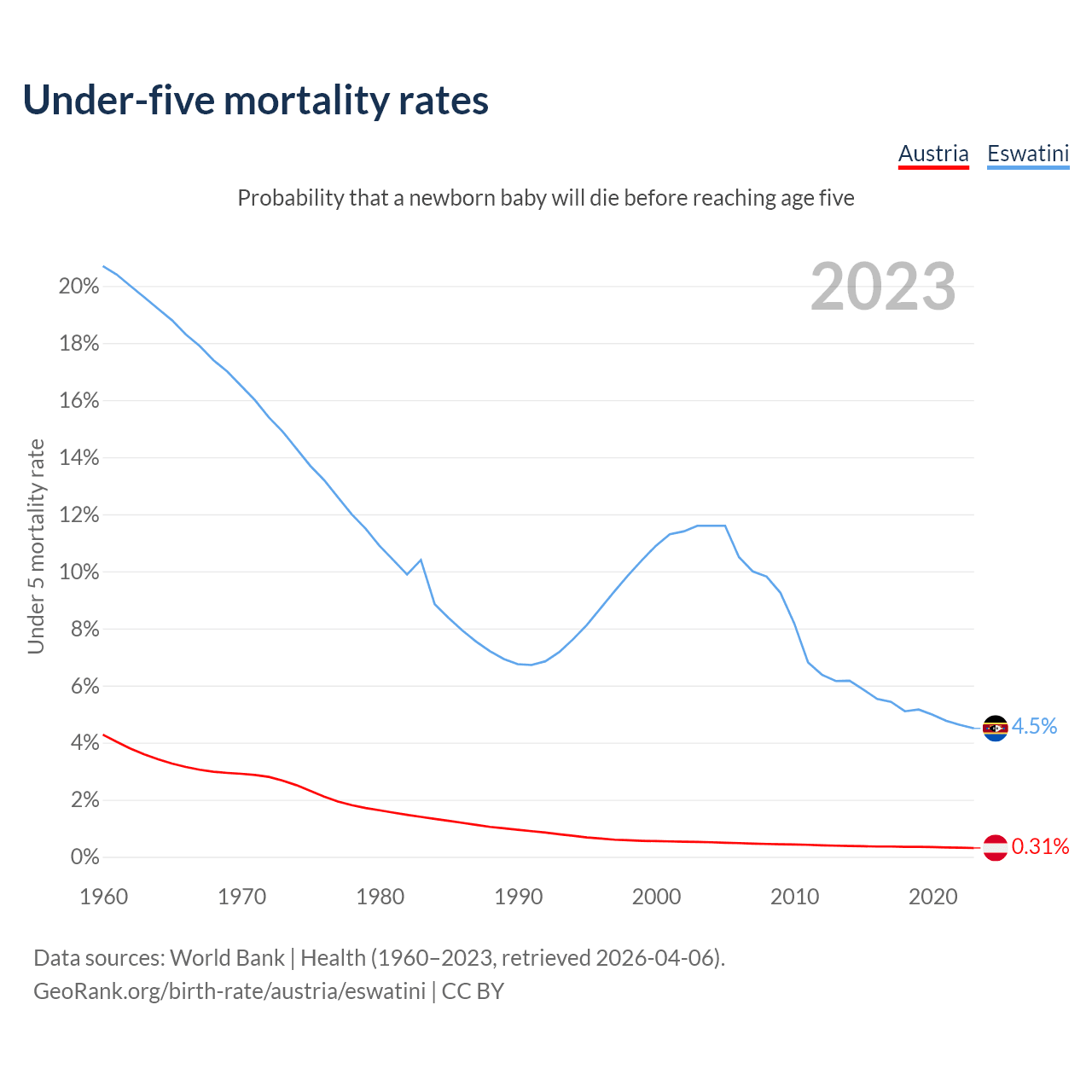 The chance that a newborn baby will die before reaching age five is 0.31% in Austria and 4.5% in Eswatini. Above is a chart with historical data on under-five mortality rates.