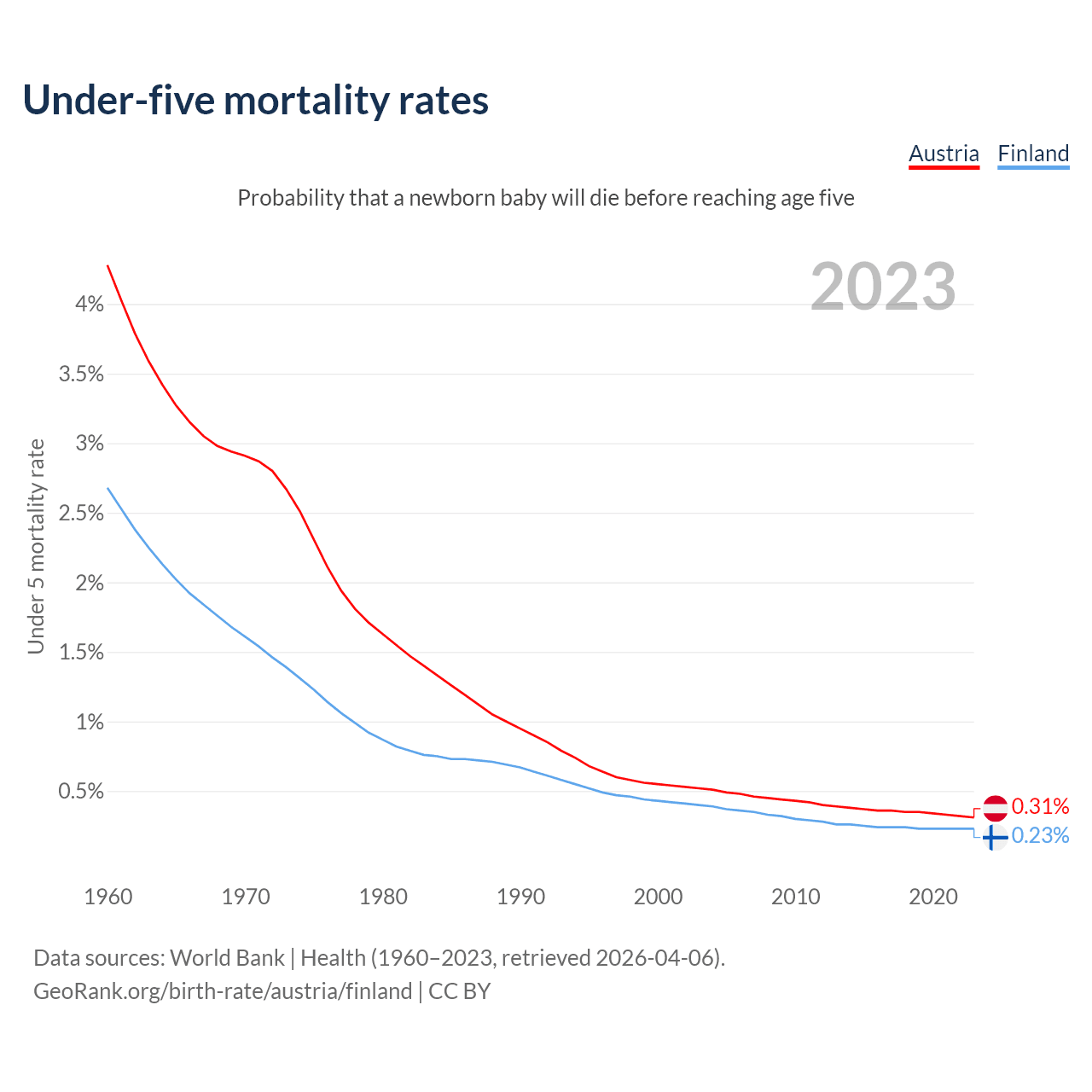 The chance that a newborn baby will die before reaching age five is 0.31% in Austria and 0.23% in Finland. Above is a chart with historical data on under-five mortality rates.