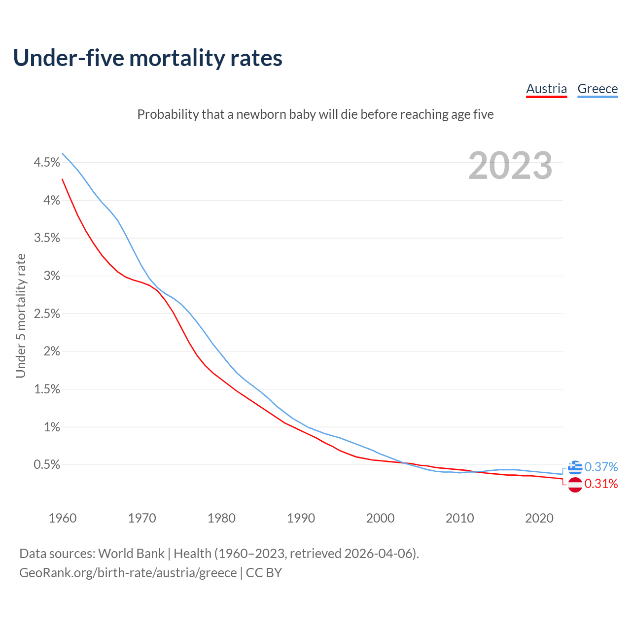 The chance that a newborn baby will die before reaching age five is 0.31% in Austria and 0.37% in Greece. Above is a chart with historical data on under-five mortality rates.