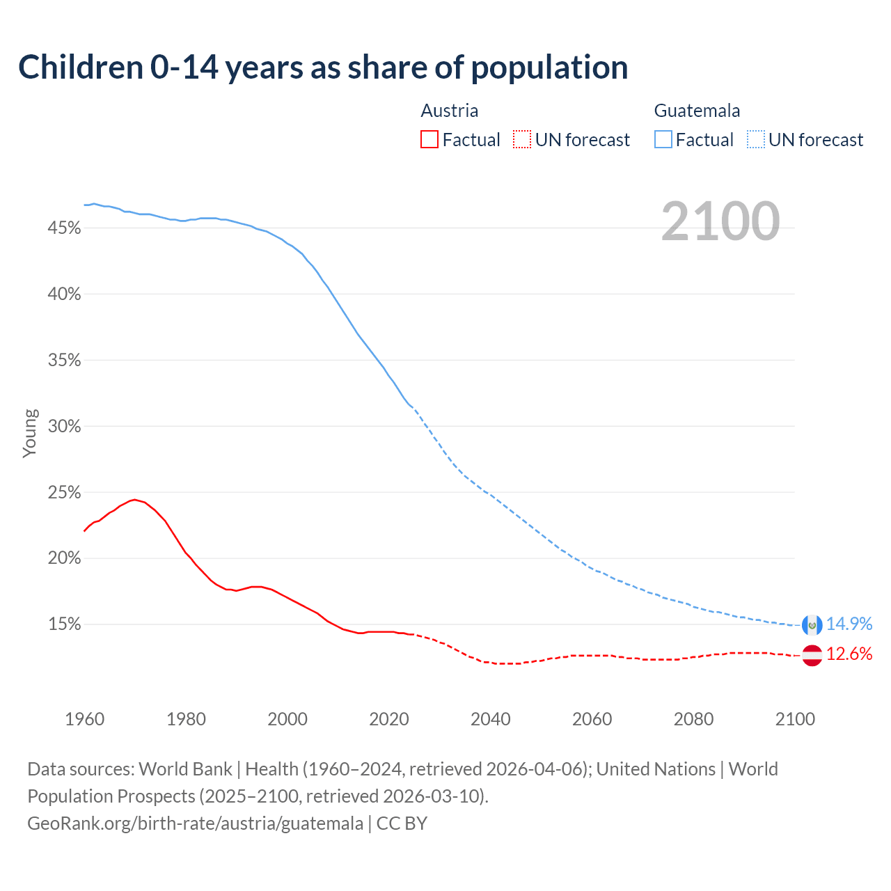 According to the latest available data on birth rates, the fertility rate in Austria was 1.32 children per woman in 2023, compared to 2.31 in Guatemala in 2023. The replacement level is considered to be 2.1 children per woman.