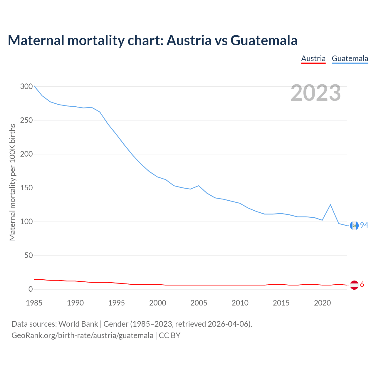 The maternal mortality rate, which is the probability of dying during childbirth or within 42 days of pregnancy termination, is 6 deaths per 100,000 live births in Austria, compared to 94 deaths in Guatemala.
