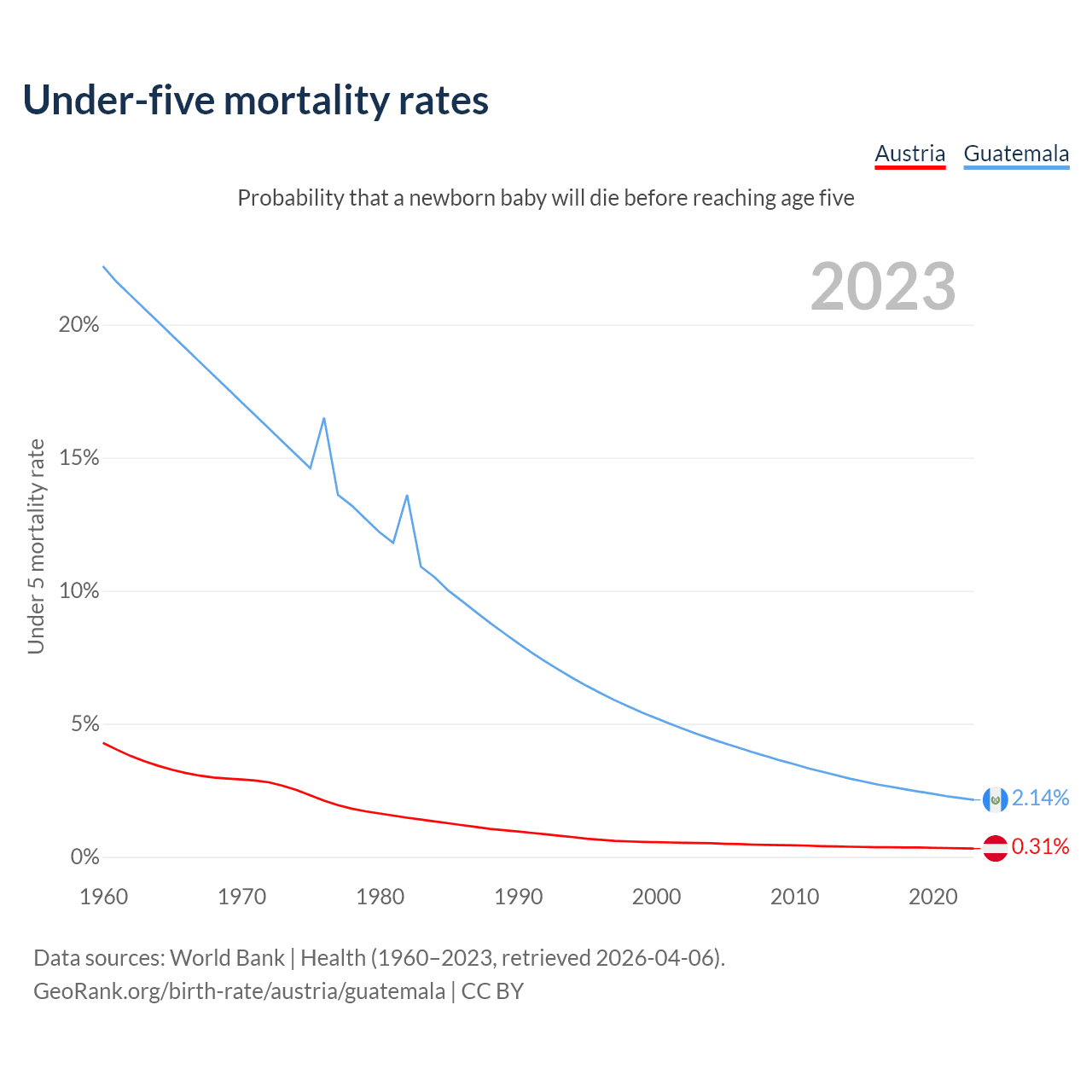 The chance that a newborn baby will die before reaching age five is 0.31% in Austria and 2.14% in Guatemala. Above is a chart with historical data on under-five mortality rates.