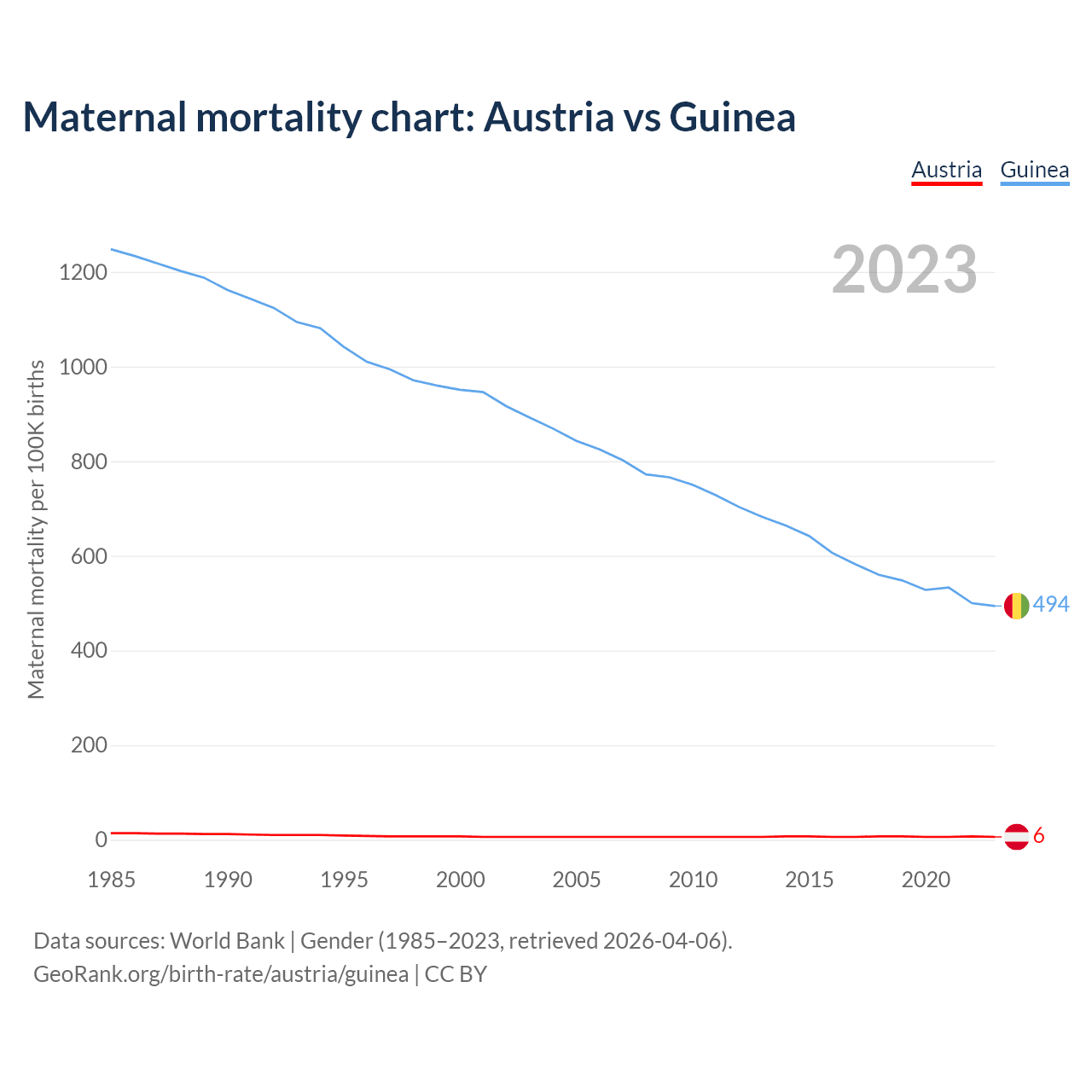 The maternal mortality rate, which is the probability of dying during childbirth or within 42 days of pregnancy termination, is 6 deaths per 100,000 live births in Austria, compared to 494 deaths in Guinea.
