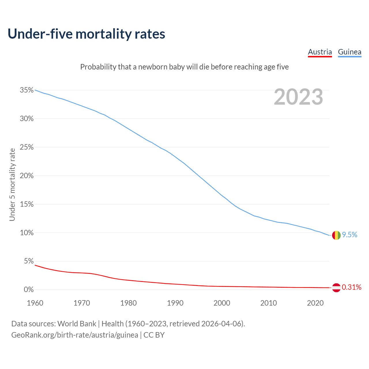The chance that a newborn baby will die before reaching age five is 0.31% in Austria and 9.5% in Guinea. Above is a chart with historical data on under-five mortality rates.