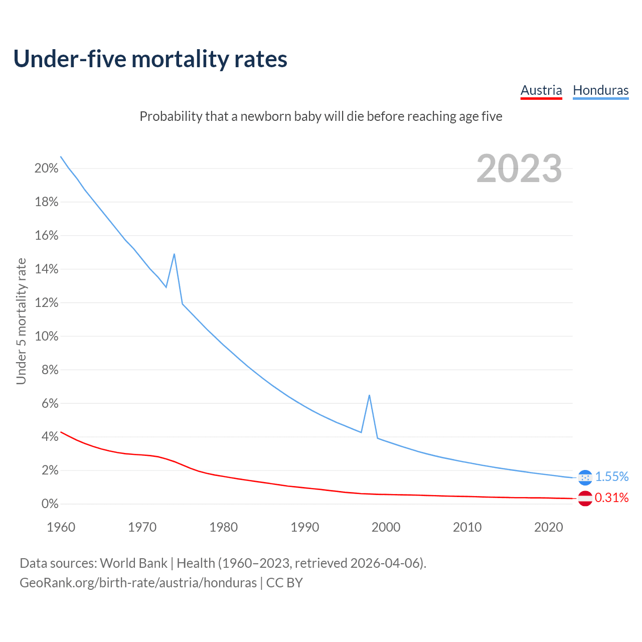 The chance that a newborn baby will die before reaching age five is 0.31% in Austria and 1.55% in Honduras. Above is a chart with historical data on under-five mortality rates.